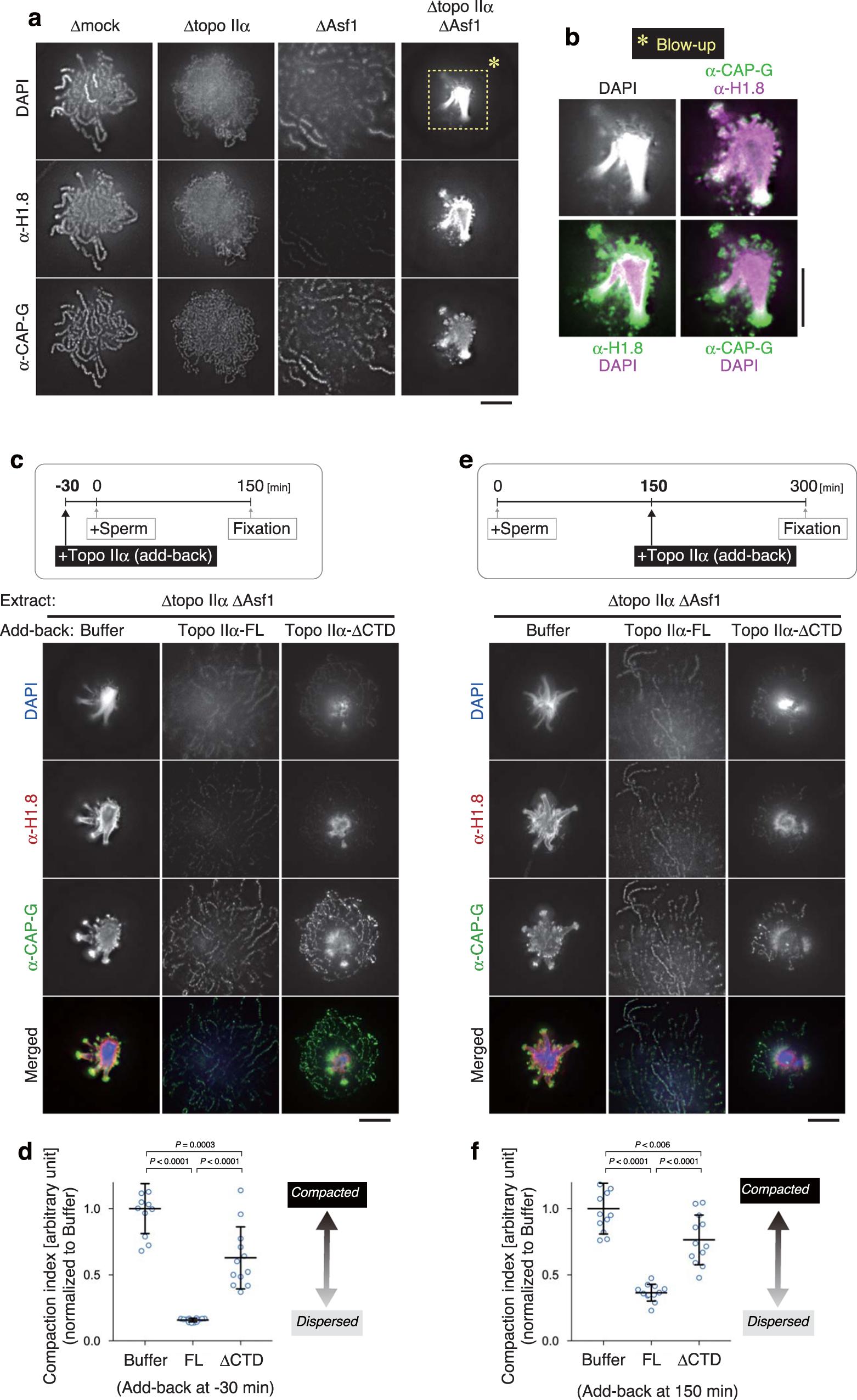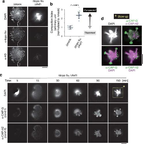 Fig. 4: An unusual chromatin structure is produced in the cell-free extract depleted of both topo IIα and Asf1. a, b Mouse sperm nuclei were incubated in a control extract (Îmock) or an extract depleted of both topo IIα and Asf1 (Îtopo IIα ÎAsf1) for 150âmin and labeled with antibodies against topo IIα and histone H3. DNA was counterstained with DAPI (a). The compaction indices (the average DAPI intensities per unit area) are plotted. The meanâ±âs.d. is shown (nâ=â10 clusters of chromatin). P values were assessed by two-tailed Welchâs t-test (b). c, d Mouse sperm nuclei were incubated in the Îtopo IIα ÎAsf1 extract at 22â°C. At the indicated time points, the reaction mixtures were fixed and labeled with antibodies against CAP-G (a condensin I subunit) and CAP-H2 (a condensin II subunit). DNA was counterstained with DAPI. This experiment was repeated three times with similar results (c). Blow-up images of the cropped part (indicated by the dashed rectangle in the original DAPI image at 150âmin) are shown in grayscale (DAPI) and pseudo-colors (merged images for the indicated combinations) (d). Bars, 5âµm. |