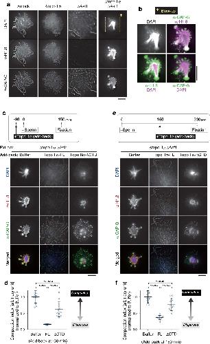 Fig. 5: Topo IIα-FL, but not topo IIα-ÎCTD, can efficiently rescue the defects observed in the extracts depleted of both topo IIα and Asf1. a, b Mouse sperm nuclei were incubated in a control extract (Îmock) or an extract depleted of either topo IIα (Îtopo IIα), Asf1 (ÎAsf1), or both (Îtopo IIα ÎAsf1). After a 150-min incubation at 22â°C, the resultant structures were labeled with antibodies against the linker histone H1.8 and CAP-G. DNA was counterstained with DAPI. This experiment was repeated three times with similar results (a). Blow-up images of the cropped part (indicated by the dashed rectangle in the original DAPI image in a Îtopo IIα ÎAsf1 extract) are shown in grayscale (DAPI) and pseudo-colors (merged images for the indicated combinations) (b) c, d An extract depleted of topo IIα and Asf1 (Îtopo IIα ÎAsf1) was supplemented with either buffer, topo IIα-FL, or topo IIα-ÎCTD. After a 30-min incubation at 22â°C, mouse sperm nuclei were added to these extracts and incubated for another 150âmin. The resultant chromatin structures were fixed and processed for immunolabeling with the antibodies indicated (c). The compaction indices were analyzed and are shown in Fig. 4b. The meanâ±âs.d. is shown (nâ=â12 clusters of chromatin). P values were assessed by two-tailed Welchâs t-test (d). e, f Mouse sperm nuclei were first incubated in a Îtopo IIα ÎAsf1 extract to allow sparkler formation. At 150âmin, the reaction mixtures were supplemented with either buffer, topo IIα-FL, or topo IIα-ÎCTD. After another 150-min incubation at 22â°C, the samples were fixed and processed for immunolabeling (e). The compaction indices were analyzed and are shown as above. The meanâ±âs.d. is shown (nâ=â12 clusters of chromatin). P values were assessed by two-tailed Welchâs t-test (f). Bars, 5âµm. |