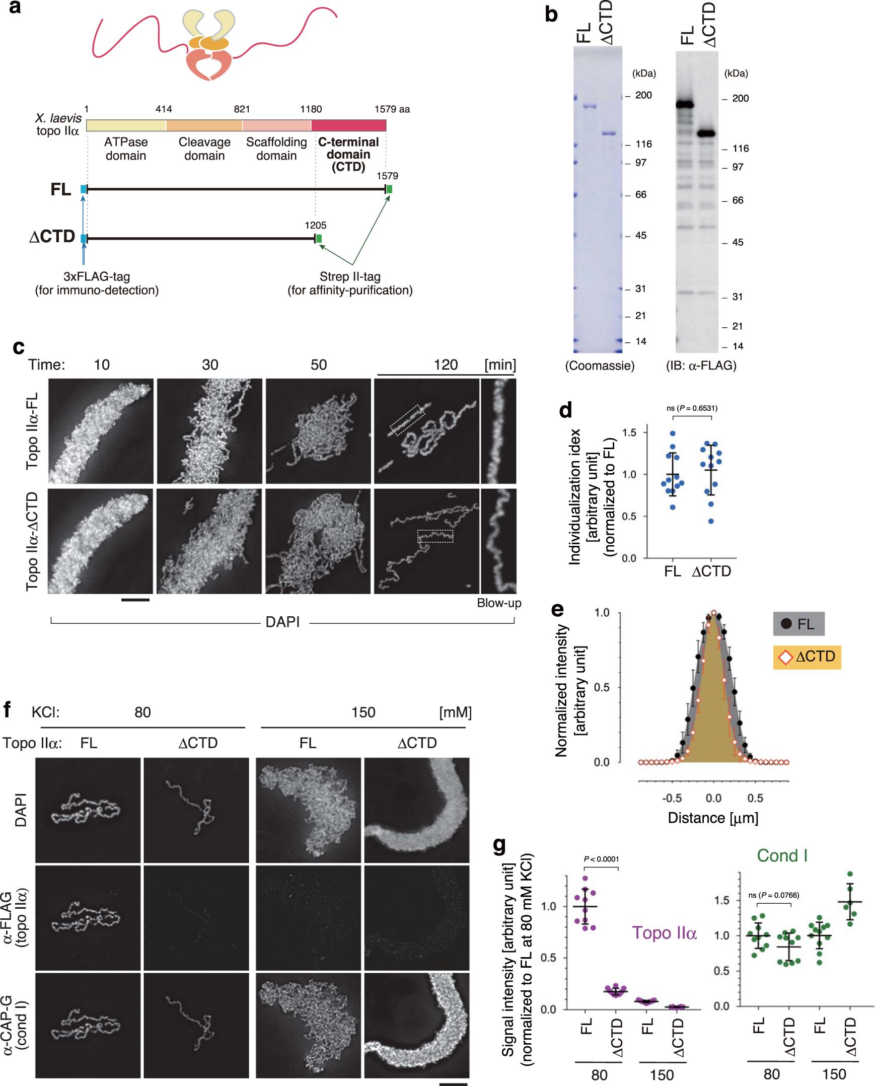 Fig. 2: Topo IIα-ÎCTD is proficient in chromatid individualization but is deficient in chromatid thickening. a Schematic presentation of structures of full-length (FL) and CTD-deleted (ÎCTD) versions of recombinant Xenopus laevis topo IIα. b Purified topo IIα-FL and topo IIα-ÎCTD were analyzed by SDS-PAGE and stained with Coomassie Blue. The same set of samples was also subjected to immunoblotting using anti-FLAG antibodies. This experiment was repeated three times with similar results. câe Xenopus sperm nuclei were incubated in the reconstitution reaction mixture containing either topo IIα-FL or topo IIα-ÎCTD. At the indicated time points, the resultant chromatin was fixed and stained with DAPI. Blow-up images of cropped parts (indicated by the dashed rectangles in the original 120-min images) are shown on the right (c). Individualization indices at 120âmin are plotted. The meanâ±âs.d. is shown (nâ=â12 clusters of chromatids). P values were assessed by two-tailed Welchâs t-test (ns not significant) (d). Profiles of normalized signal intensities of DAPI along lines drawn perpendicular to chromatid axes were analyzed. The meanâ±âs.d. is shown (nâ=â15 lines from 5 chromatids) (e). f, g Chromatid reconstitution assays were performed with topo IIα-FL or topo IIα-ÎCTD in a buffer containing 80âmM or 150âmM KCl. After a 150-min incubation, the resultant structures were fixed and processed for immunolabeling (f). Signal intensities of topo IIα and CAP-G on chromatids were analyzed. The meanâ±âs.d. is shown (nâ=â9 clusters of chromatin). P values were assessed by two-tailed Welchâs t-test (ns not significant) (g). Bars, 5âµm. |