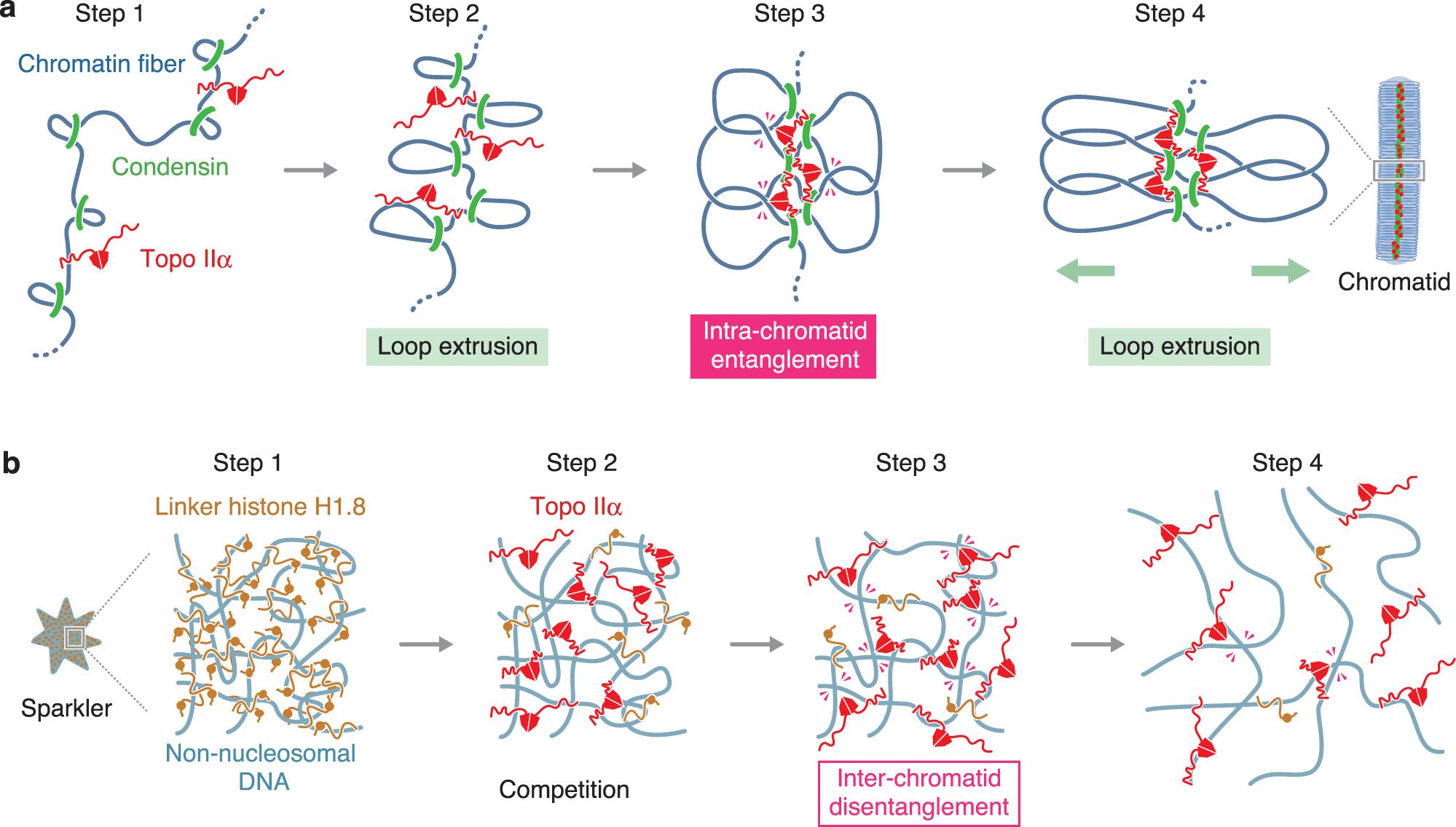 Fig. 6: Models for the actions of topo IIα in crowded environments created during mitotic chromatid assembly. a A model for chromatid thickening by collaborative actions of topo IIα and condensins. At the initial step of chromatid assembly, intra-chromatid entanglements are hardly generated because loops are distantly located from one another (step 1). As condensins extrude the loops, the distance between neighboring loops gets shortened (step 2), allowing chromatin-associated topo IIα to generate entanglements between loops (step 3: intra-chromatid entanglement). The resultant intra-chromatid entanglements in turn stabilize chromatid axes and may promote further extrusion of the loops and thickening of the chromatids (step 4). For simplicity, structural changes of an individualized, single chromatid are shown here. b A model for resolution of a pre-assembled sparkler. A sparkler is composed of multiple non-nucleosomal DNAs that are heavily entangled with each other and bound by the linker histone H1.8 (step 1). When topo IIα is added into the reaction, its CTD competes with the linker histone for the non-nucleosomal DNAs and delivers the enzymatic core into the inside of the sparkler (step 2). Topo IIα catalyzes disentanglement reactions there (step 3: inter-chromatid disentanglement), which in turn promotes further dissociation of the linker histone and resolves the sparkler (step 4). For simplicity, condensins’ actions are not depicted here. |
