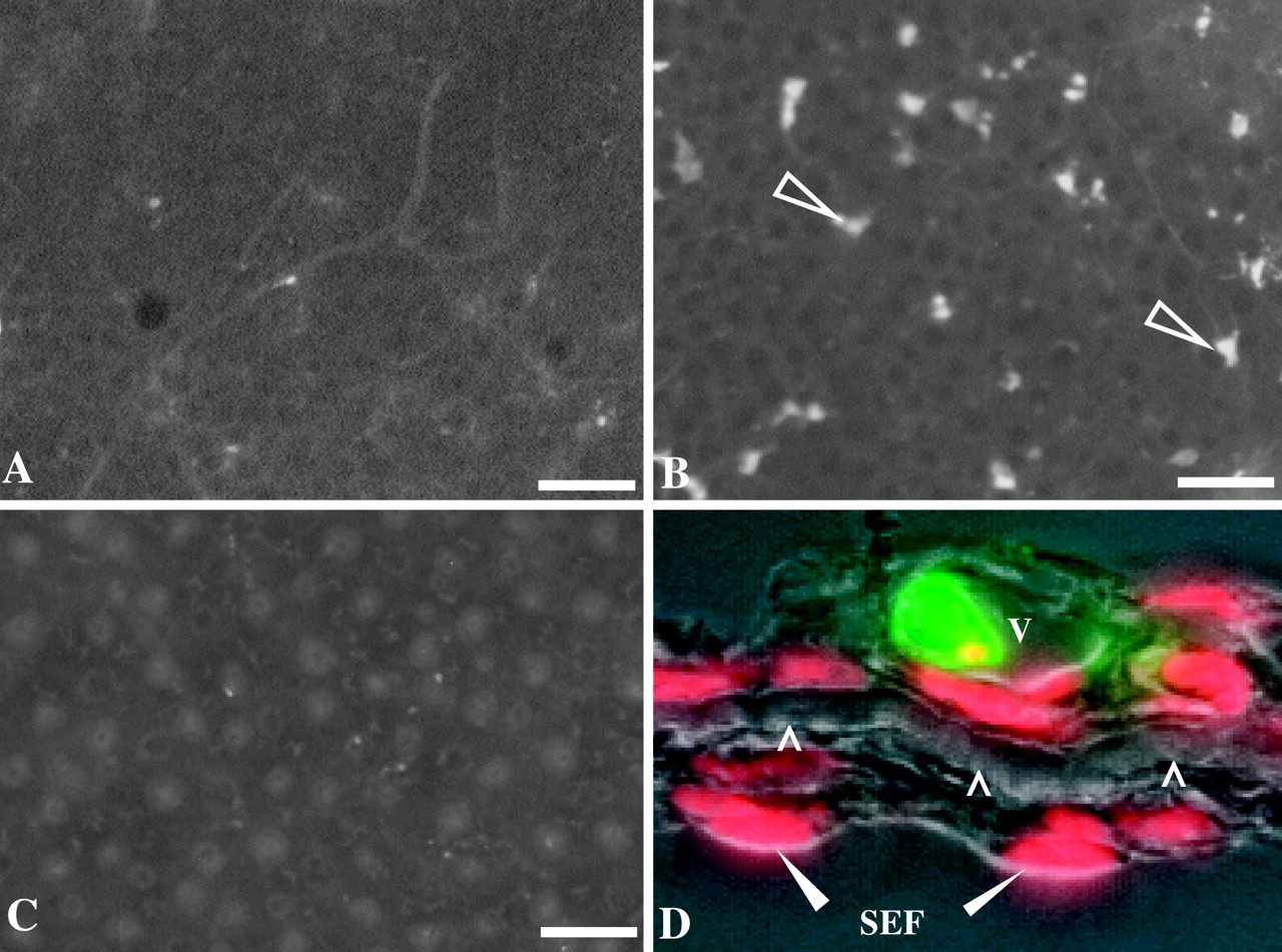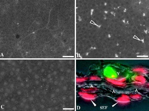 Larval epithelial cell death at metamorphic climax coincides with expression of active caspase-3. Active caspase-3 immunoreactivity detected in whole-mount processed skin from the body is rarely present in larval skin before metamorphosis (NF 57) (A), strongly present at the start of metamorphic climax (NF 60; arrows) (B), and rarely present at the peak of climax (NF 62) after the larval skin has been replaced by adult skin (C). Adult skin glands present at NF 62 are weakly autofluorescent. (D) Active caspase-3 immunoreactivity (green) in cross sections of NF 60 skin is confined to a vacuolated cell (v) in the larval epithelium; red, 4â²,6-diamidino-2-phenylindole (DAPI) nuclear counterstain; arrowheads, collagen lamella; solid arrowheads, subepithelial fibroblasts (SEF). [Scale bars: 100 μM (AâC) and 5 μM (D).]