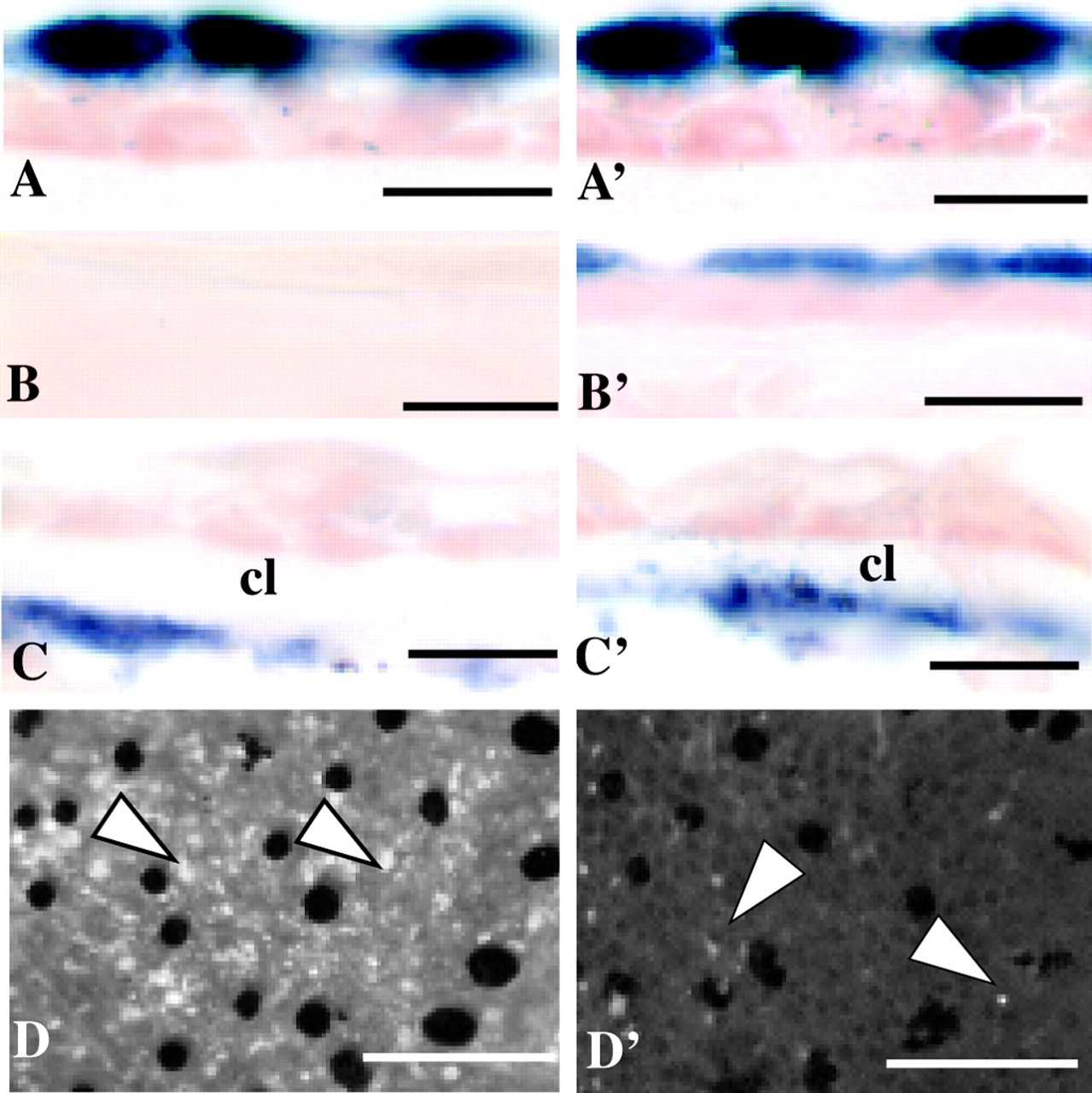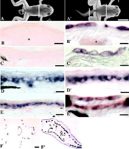 Froglets (NF 64) transgenic for Ker:TRDN retain larval epithelium at the end of metamorphosis. Vertical lines denote regions of skin sectioned from the body and tail of a WT (A) and Ker:TRDN (Aâ²) froglet. (B) Gene 19 expression (dark blue/purple) visualized by in situ hybridization is absent in WT body and tail (F) skin but retained in transgenic body (Bâ²) and tail (Fâ²) skin (black dots are pigment clusters). * denotes adult skin glands. Larval keratin expression in body skin is absent in WT (C) but present in transgenic (Câ²) skin. Adult keratin is expressed in basal cells of both WT (D) and transgenic (Dâ²) skin. Body skin labeled with both gene 19 and adult keratin show the retention of gene 19 expression in transgenic skin (Eâ²), but not in control skin (E). Control (F) and transgenic (Fâ²) tail tips hybridized with gene 19 probe identify retention of larval gene expression in the Ker:TRDN animal. [Scale bars: 500 μM (A and Aâ²), 5 μM (BâEâ²), and 50 μM (F and Fâ²).]