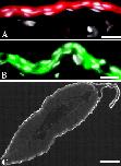 Larval keratin colocalizes with GFP expression in tadpoles transgenic for Ker:GFP. (A) Larval keratin immunoreactivity (red) in the body skin of a premetamorphic tadpole (NF 54) is confined to the epithelial layer. (B) The larval keratin promoter drives GFP expression (green) specifically in the epithelial layers of skin from the body. (C) Cross section of the tail showing expression of Ker:GFP (white). A and B are counterstained with 4â²,6-diamidino-2-phenylindole (DAPI) (white). [Scale bars: 10 μM (A and B) and 100 μM (C).]