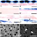 Larval and adult-specific epidermal markers. Tadpoles and cross sections taken from dorsal skin (vertical lines) of premetamorphic stage NF 57 (AâE) and metamorphic climax stage NF 62 (Aâ²âEâ²). Sections were stained with hematoxylin and eosin (B and Bâ²), in situ hybridizations with antisense RNA probes (dark blue/purple) against gene 19 (C and Câ²), larval keratin (D and Dâ²), and adult keratin (E and Eâ²). Eosin stains the epithelial layers bright pink; black arrowheads (B) denote subepithelial fibroblasts, white arrowheads (Bâ²) denote adult dermis. [Scale bars: 500 μM (A and Aâ²) and 5 μM (BâEâ²).]