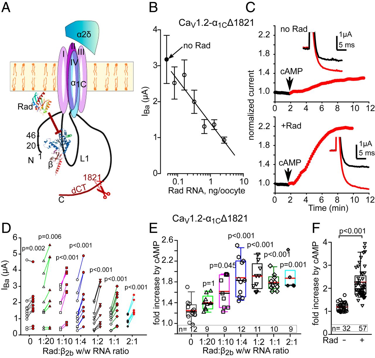 cAMP regulation of CaV1.2 is enhanced by coexpression of Rad. (A) CaV1.2 and Rad. α1C and α2δ subunits are shown schematically, with structures of β2b (38) and Rad (74). The truncation in α1CΔ1821 was at a.a. 1,821 (red cross mark) similar to naturally truncated cardiac α1C, ∼a.a. 1800 (9). CaVβ binds to the cytosolic loop I, L1, that connects repeat domains I and II. Rad exerts inhibitory action on the channel, in part through an interaction with CaVβ. (B) Rad reduces the Ba2+ current of CaV1.2-α1CΔ1821 (α1CΔ1821, β2b and α2δ; 1.5 ng RNA of each subunit) in a dose-dependent manner. Pearson correlation, r = −0.82, P = 0.023. Each point represents mean ± SEM from 7 to 10 oocytes recorded during 1 d. The linear regression line was drawn for nonzero doses of Rad. (C) Rad enhances the cAMP-induced increase in IBa. Diary plots of the time course of change in IBa (normalized to initial IBa) are shown before and after intracellular injection of cAMP in representative cells. No Rad: Upper; with Rad: Lower. (Insets) Currents at +20 mV before (black trace) and 10 min after cAMP injection (red trace). (D) “before–after” plots of cAMP-induced changes in IBa in individual cells injected Rad RNA while varying Rad:β2b RNA ratio (by weight, wt/wt). Empty symbols–before cAMP; red-filled–after cAMP. n = 3 experiments; statistics: paired t test. (E) cAMP-induced increase in IBa at different Rad/β2b RNA levels (summary of data from D). Each symbol represents fold increase in IBa induced by cAMP injection in one cell. Here and in the following figures, box plots show 25 to 75 percentiles, whiskers show the 5/95 percentiles, and black and red horizontal lines within the boxes are the median and mean, respectively. At all Rad:β2b RNA ratios except 1:20, the cAMP-induced increase in IBa was significantly greater than without Rad (Kruskal–Wallis test; H = 36.1, 6 degrees of freedom, P F) Summary of cAMP effects in 10 experiments without and with Rad at 1:2 and 1:1 Rad:β2b RNA ratios (pooled). Number of cells: within the bars. Statistics: Mann–Whitney U test; U = 19.0, P |