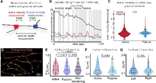 Figure 4—figure supplement 1. Extended analysis pertaining to cdh3 clustering and actin next to junctions (Appendix, Section 16).(A) Schematic showing how actin was measured next to active and passive vertices at shortening v-junctions. (B) Graph showing junction length and actin intensities over time for a single shortening junction. The black line is junction length, red is actin intensity next to the active vertex, and blue is actin intensity next to the passive vertex. (C) Graph showing normalized actin intensity next to active (red) or passive vertices. Intensity was normalized to account for expression by dividing each datapoint by the mean intensity of the dataset. Conditions were statistically compared using a t-test. (D) Immunostaining for endogenous Cdh3 showing that the endogenous protein forms cadherin cis-clusters. (E) Violin plot of Cdh3 cluster sizes next to active vertices (red), passive vertices (blue), and non-shortening left and right vertices (black) for all frames including shortening and non-shortening events. Statistical significance was assessed using a Kolmogorov-Smirnov test. (F) An alternative definition of cluster size was used to analyze differences in cadherin clustering. By fitting an exponential function to the spatial autocorrelation of cadherin intensity fluctuation, we extract the characteristic cadherin cluster size. Violin plot shows the Cdh3 cluster sizes for active versus passive vertices in shortening junctions. 1538 frames from 10 embryos were analyzed. Kolmogorov-Smirnov shows significant differences between Cdh3 clustering near active versus passive vertices (p=0.004). (G) Violin plot of Cdh3 cluster sizes for left versus right vertices in non-shortening junctions. A total of 2062 frames from seven embryos were analyzed. Kolmogorov-Smirnov did not indicate significant differences between Cdh3 clustering near left versus right vertices (p=0.07). |