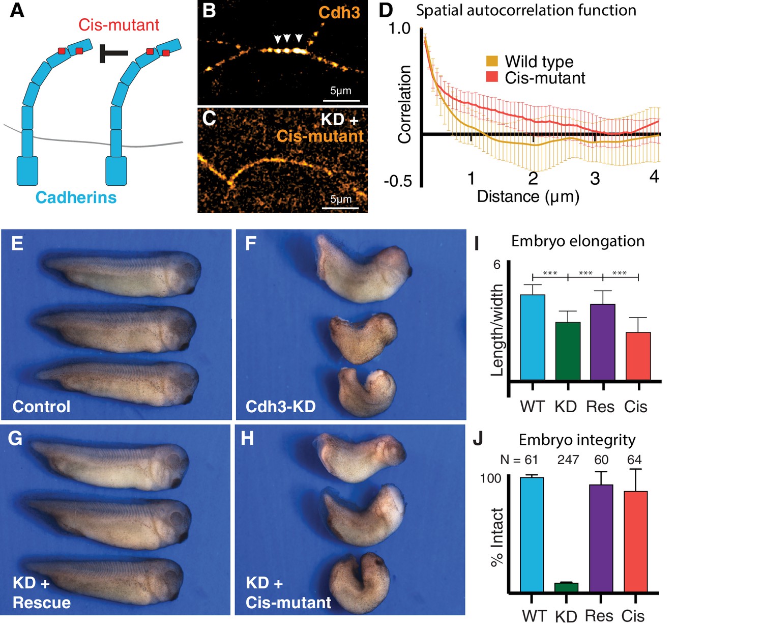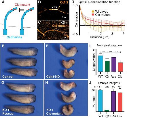 Figure 5. Cdh3 cis-clustering is required for convergent extension but not homeostatic tissue integrity.(A) Mutations used to inhibit cadherin cis-clustering. (B) Cdh3-GFP clustering in a control embryo. (C) Cis-clusters absent after re-expression of cisMut-Cdh3-GFP. (D) Mean spatial autocorrelation of Cdh3-GFP intensity fluctuations for wild type (60 image frames, from 10 embryos) and the cis-mutant (56 image frames, five embryos) (Appendix, Section 17). Gradual, non-exponential decay for cisMut-Cdh3-GFP indicates a lack of spatial order (i.e. failure to cluster). (E) Control embryos (~stage 33). (F) Sibling embryos after Cdh3 knockdown. (G) Knockdown embryos re-expressing wild-type Cdh3-GFP. (H) Knockdown embryos re-expressing cisMut-Cdh3-GFP. (I) Axis elongation assessed as the ratio of anteroposterior to dorsoventral length at the widest point. (J) Embryo integrity assessed as percent of embryos alive and intact at stage 23. |