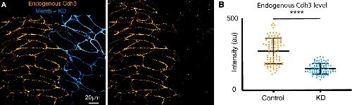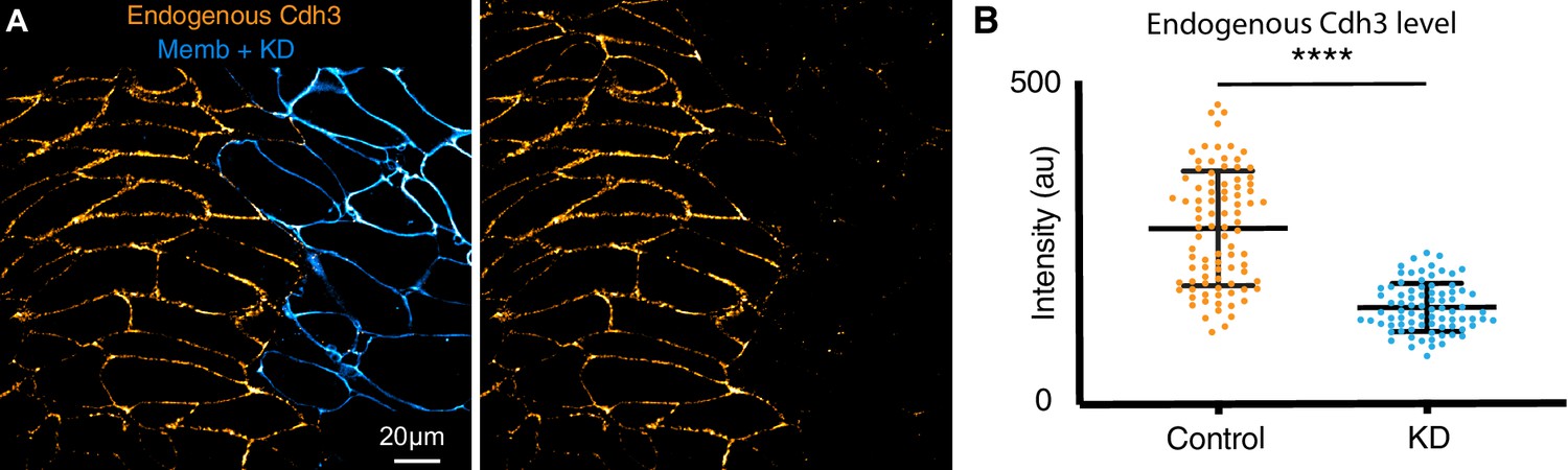 Figure 5—figure supplement 1. Cdh3 knockdown.(A) Embryos were injected with Cdh3-MO and membrane-BFP in a single dorsal blastomere at the four-cell stage resulting in mosaic depletion of Cdh3. Here, immuno-staining for Cdh3 shows that the protein was depleted specifically in cells that received the morpholino, as marked by membrane-BFP. (B) Cdh3 immuno-staining intensity was measured in control cells and neighboring Cdh3-MO cells from mosaic animals. These data were derived from three replicate experiments and statistically analyzed by t-test. |
