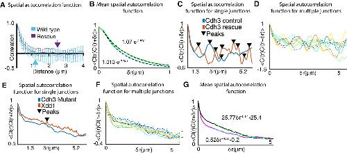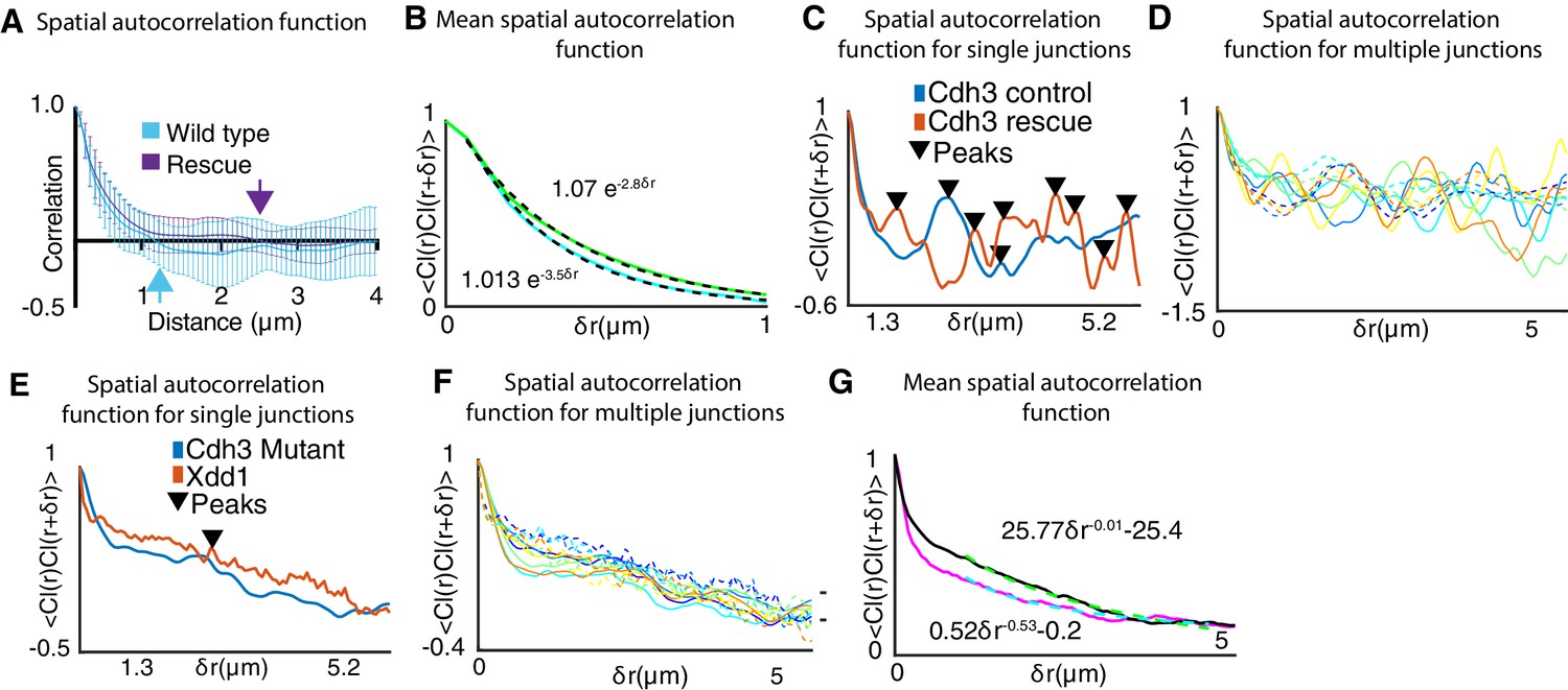Figure 7—figure supplement 1 Extended analysis of cadherin clustering for the cis-mutant, rescue, and Xdd1. (A) Spatial autocorrelation of Cdh3 intensity fluctuations for wild type (60 frames, obtained from 10 embryos) and Cdh3-rescue (58 frames, obtained from 4 embryos). The characteristic correlation length decays to zero at ~1 μm , for both wild type and rescue embryos. Error bar is the standard deviation. (B) Mean spatial autocorrelation of Cdh3 intensity fluctuations for wild type and rescue with functional fits to the decay behavior. Both spatial correlations can be fit to an exponential. This is evidence for a characteristic spatial scale for the correlation in spatial Cdh3 intensity fluctuations. (C) Single junction spatial autocorrelation of cadherin intensity fluctuations in Cdh3 wild type and rescue embryos. Local maxima in the Cdh3 spatial correlation are indicated as peaks (Appendix, Section 17). This shows the well-defined spatial periodicity in Cdh3 distribution along the cell-cell junction for both wild type and rescue embryos. (D) Spatial autocorrelation of cadherin intensity fluctuations in Cdh3 control (solid lines) and Cdh3 rescue (dashed lines) embryos along a single junction at five different time frames. (E) Single junction spatial autocorrelation of cadherin intensity fluctuations in Cdh3 mutant and Xdd1 mutant embryos. As compared to wild type and rescue embryos, local maxima in the Cdh3 spatial correlation is highly suppressed. The spatial periodicity of Cdh3 distribution along the cell-cell junction is not seen. (F) Spatial autocorrelation of cadherin intensity fluctuations in Cdh3 mutant (solid lines) and Xdd1 mutant (dashed lines) embryos along a single junction at five different time frames. (G) Mean spatial autocorrelation of Cdh3 intensity fluctuations for Xdd1(black) and Cdh3 mutant (magenta) with functional fits to the decay behavior. Both spatial correlations decay to zero is better fit to a power law. This is evidence for the lack of characteristic spatial scale for the correlation in spatial Cdh3 intensity fluctuations. |