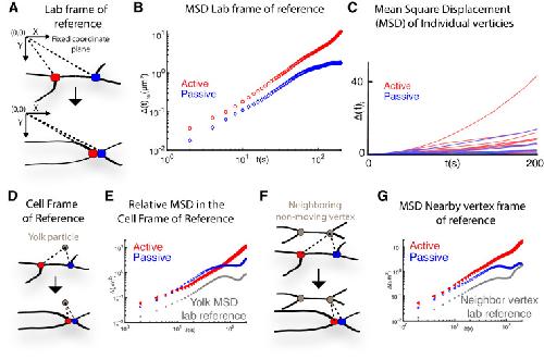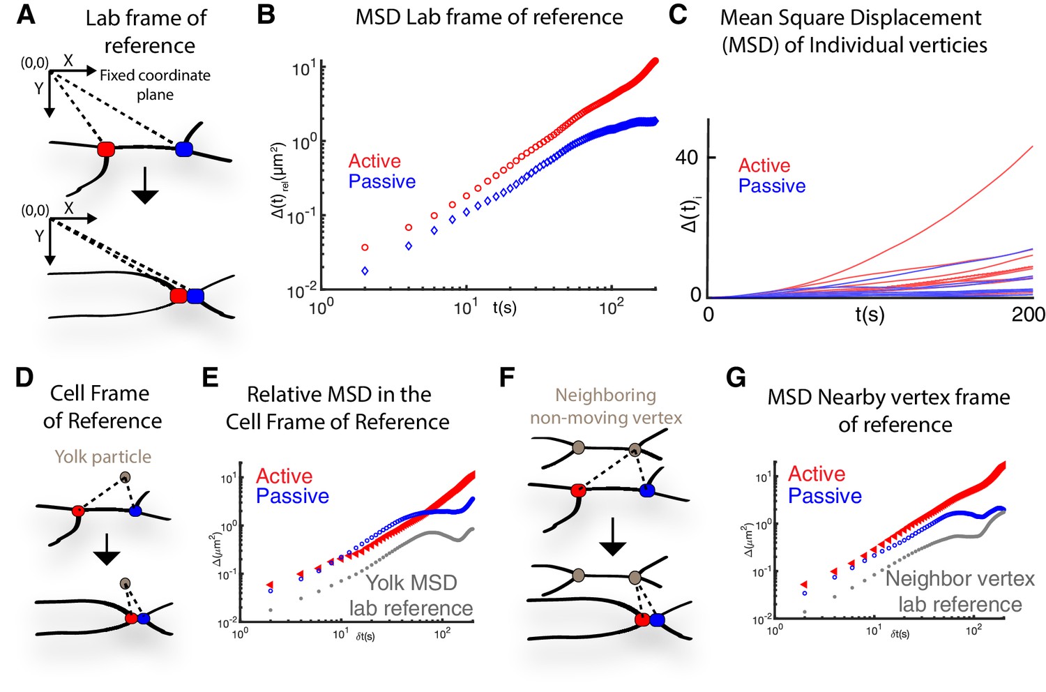 Figure 1—figure supplement 2 Mean squared displacement measured from multiple frames of reference. Appendix, Section 1. (A) Schematic showing how vertex MSD was measured from the lab frame of reference. Here the coordinate plane was set with the upper left corner of the image as (x,y)(0,0) and the pixels of the image were used as a fixed coordinate plane to measure the MSD. (B) Mean squared displacement of a pair of active and passive vertices in the lab frame of reference. (C) Mean squared displacements (MSD),Δ(t)i , of 10 distinct individual active (red) and passive (blue) vertices. The heterogeneity in individual vertex movements is apparent from the wide variation in individual vertex MSDs. See for details on the MSD calculation. (D) Schematic showing how vertex mean square displacement was measured relative to yolk particles that are present in the embryonic Xenopus cells. We refer to this as the relative MSD in the cell frame of reference. (E) Relative mean squared displacement, Δ(t)rel , of vertices with respect to a yolk particle within a cell (cell frame of reference). Also included is the yolk particle MSD, calculated from the lab frame of reference (gray), to show minimal movement of the yolk compared to the vertices. (F) Schematic showing how vertex mean square displacement was measured relative to a neighboring vertex from other cells. This is the MSD in the nearby vertex frame of reference. (G) Relative mean squared displacement, Δ(t)rel , of the same pair of active and passive vertices in B (above) with the displacement analyzed relative to a nearby quasi-stationary vertex. The neighboring vertex MSD is also included as calculated from the lab frame of reference (gray). |