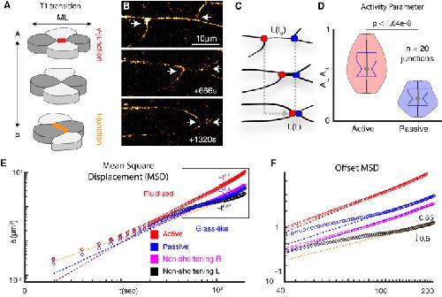 Figure 1. Vertices bounding shortening v-junctions are physically asymmetric and display heterogeneous fluid and glass-like dynamics.(A) A four cell T1 transition with mediolaterally (ML)-aligned ‘v-junctions’ (red) and anterior-posterior (A/P) aligned t-junctions (orange) indicated. (B) Frames from time-lapse showing vertex movements of a v-junction; arrows highlight vertices. Frames were acquired at a z-depth of 5 μm above the ECM/coverslip and with a time interval of 2 s. (C) Schematic of asymmetric vertex movements from B; active = red; passive = blue. (D) Vertex motion quantified by the activity parameter, as described in Appendix, Section 1. (N = 42 vertices from 20 embryos; t-test p value is shown). (E) MSD reveals active vertices’ persistent superdiffusive movement (red); passive vertices exhibit intermediate time slowdown (blue). Pink and black display MSD for left and right non-shortening junctions. MSD is described in Appendix, Section 2. (F) MSD from boxed region in E is shown with traces offset for clarity (0.5 for left; 0.65 for right)(N = 20 vertices from 10 embryos). |