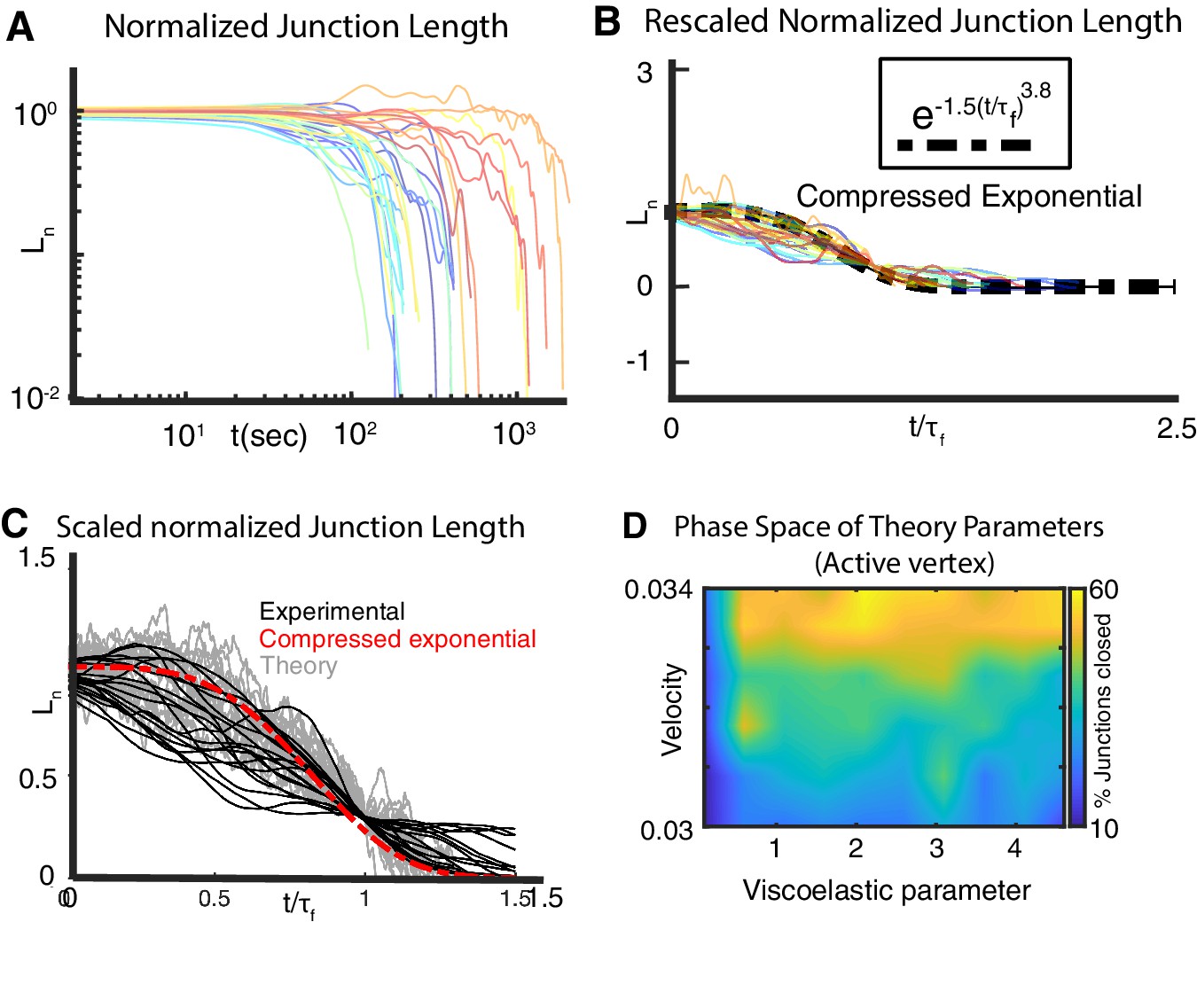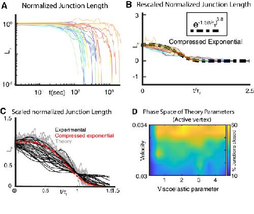 Figure 2—figure supplement 1 Extended analysis comparing in vivo and in silico junction dynamics. (A) C. Normalized relative change in length, Ln(t)=L(t)−L(tf)L(to)−L(tf) , versus time for shortening mediolateral cell-cell junctions during CE. 21 individual junctions from 20 embryos are analyzed. L(t0) and L(tf) are the junction lengths at initial time t0 and final time tf , respectively (Appendix, Section 9). (B) Although the normalized lengths vary considerably from one embryo to another, the Ln nearly collapse onto a single universal curve (black dashed line) when the time axis is scaled by the relaxation time τf . The relaxation time is defined as Ln(t=τf)=0.3. This is evidence of the underlying self-similarity of the cell rearrangement process contributing to CE (Appendix, Section 9). (C) Comparison between experimental (black) and theoretical (gray) normalized junction length vs time for shortening junction shows that the model captures experimentally observed features of junction shortening during convergent extension. (D) Phase diagram for an alternative model (Appendix, Section 11) of active versus passive vertex contribution to junction shortening. Instead of accelerating vertices, we consider the velocity of vertices to be constant. Active vertex velocity is taken to be larger than the passive vertex. Simulations using the alternative model tell us that the viscoelastic parameter controls junction shortening. Our conclusion on the importance of the viscoelastic parameter in effecting junction shrinking is independent of the details of the vertex dynamics. |