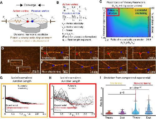 Figure 2 with 1 supplement A new vertex model incorporating local mechanical heterogeneity recapitulates the fine-scale dynamics of junction shortening observed in vivo. (A) Sketch of v- junction shortening with elements of the model overlain. Active (red) and passive (blue) vertex movements are affected by a piston modulating the dynamic rest length. The vertices execute elastic motion due to springs of elasticity, kL and kR . L,R indices indicate left and right. The thicker spring indicates a stiffer elasticity constant, kL . (B) Equations of motion for active and passive vertex positions, xL and xR . Displacement of the left (right) vertex due to the piston is determined by the forces FL(FR) whose time dependence is determined by the rest length exponent,ψL(ψR) . The friction experienced by the left (right) vertices are modeled using γL(γR). ζL is the colored noise term for the left vertex (Appendix, Section 4-6). (C) Heatmap indicating probability of successful junction shortening (legend at right) in parameter space for the viscoelastic parameter near vertices and the rest length exponent, staying within biologically reasonable values based on data from Drosophila (Solon et al., 2009; Appendix, Section 6). (D) Still image from a time-lapse of Xenopus CE. Insets indicate representative shortening and non-shortening junctions shown in Panels E and F (vertices indicated by arrowheads). (G) Normalized change in length, Ln , for shortening junctions in vivo (black lines) and in simulations using asymmetric viscoelastic parameters (gray lines) resembling the compressed exponential form (red, dashed line) after the time axis is rescaled. (H) Normalized change in length, Ln , for non-shortening junctions in vivo (black lines) and in simulations using symmetrical viscoelastic parameters (gray lines). (I) Quantification of relaxation behavior deviation from the compressed exponential using the residue (Appendix, Section 8-10). |
