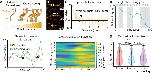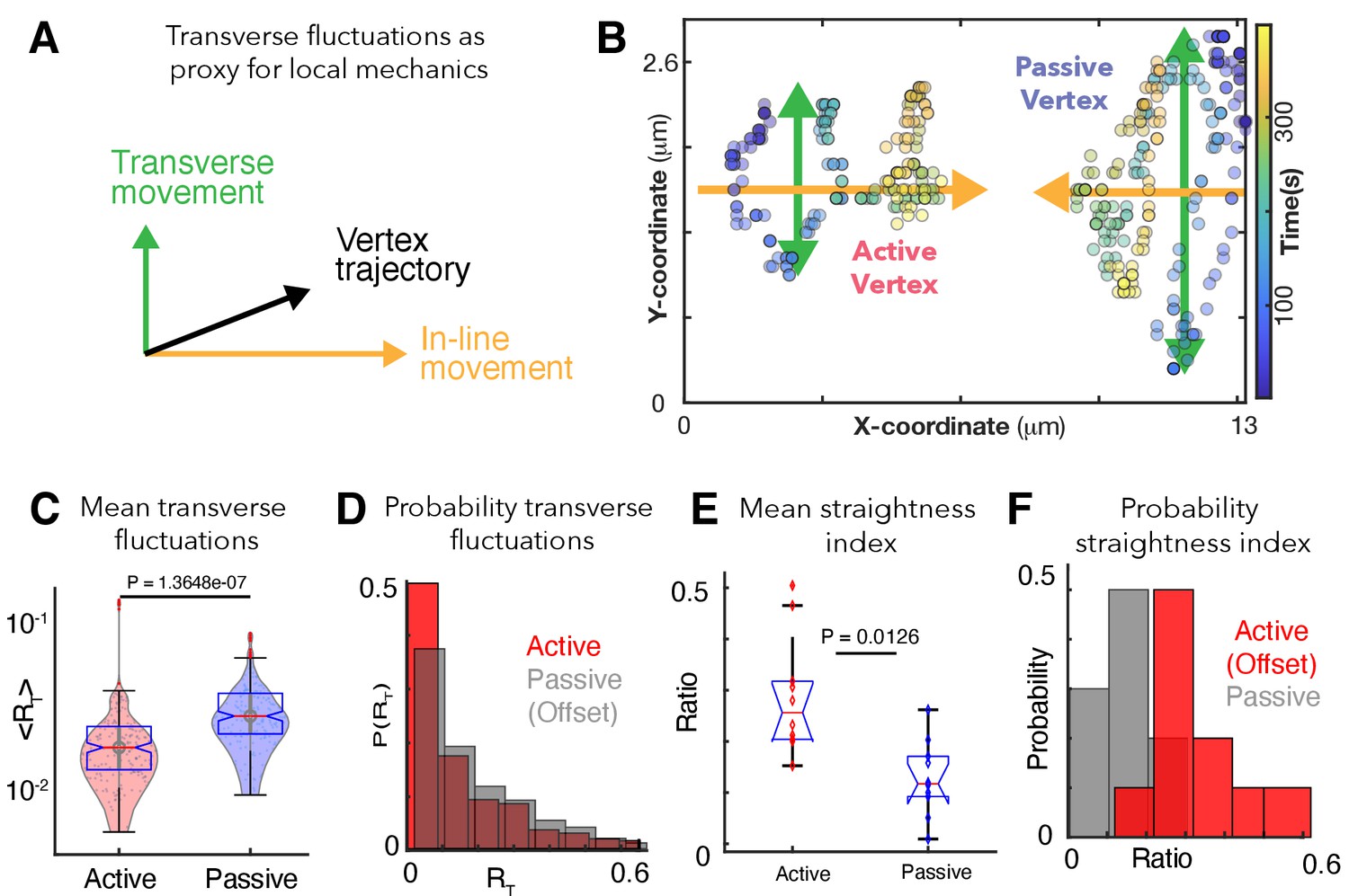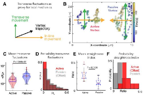 Figure 3. Patterns of transverse vertex fluctuations reveal mechanical heterogeneity of active and passive vertices in vivo.(A) Schematic of transverse fluctuations in the vertex position perpendicular to the direction of junction shortening; traverse movements are extracted using the transverse 'hop' function, which is inversely proportional to the local vertex stiffness (Appendix, Section 12). (B) X/Y coordinates for a representative pair of active and passive vertices color coded for time, with transverse (green) and in-line (orange) motion indicated. (C) Mean transverse fluctuation ⟨RT⟩, for active and passive vertices. (N=20 vertices; 10 embryos over 386 seconds; t-test p value shown). (D) Probability distribution of transverse fluctuations, RT, (offset for clarity). (E) Straightness index quantifying the persistence of vertex motion in terms of directionality (Appendix, Section 12); t-test p value is shown. (F) Probability distribution of the straightness index for active (red, offset for clarity) and passive (blue) vertices. |
