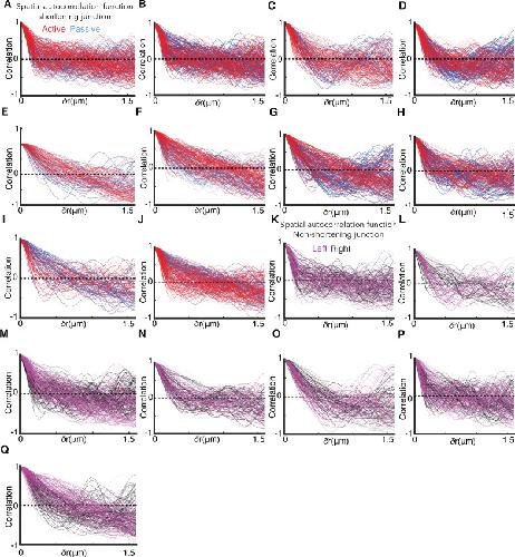 Figure 4—figure supplement 2 Source data for spatial correlation of Cdh3 intensity fluctuations reveal extreme heterogeneity in cluster size. (A-J) Individual (time frame by frame) spatial correlation vs distance curves selecting for shortening events from 10 distinct cell-cell junctions that undergo successful junction shortening (Appendix, Section 16). Cadherin spatial correlation near active (passive) vertices are shown in red (blue) lines. (K-Q) Individual (time frame by frame) spatial correlation vs distance curves from seven distinct cell-cell junctions that do not successfully shorten. Cadherin spatial correlation near left (right) vertices are shown in magenta (black) lines (Appendix, Section 16). |