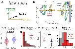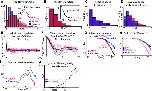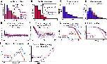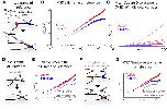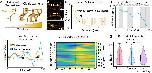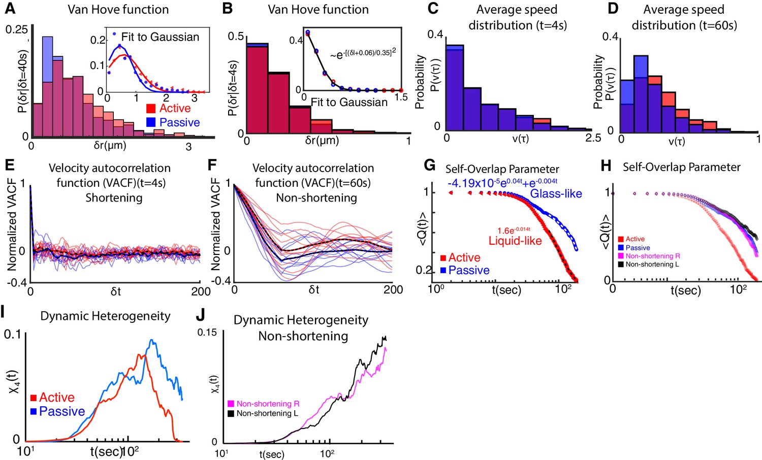 Figure 1—figure supplement 3 Extended analysis of vertex glass-like dynamics. (A) Probability distribution of active (red) and passive (blue) vertex displacements, referred to as the van Hove function (see Equation 4 in Appendix Section 2), shows distinct non-Gaussian functional form. Inset shows deviation of the van Hove function from fits to Gaussian function P(δr)=0.14e−(δr−0.580.76)2 for the active vertex and P(δr)=0.18e−(δr−0.460.59)2 for the passive vertex. Probability distribution of distances moved over a time scale of δt=40s , clearly shows the enhanced distance moved by active vertices as compared to passive vertices. Probability distribution is obtained for 20 individual vertices from 10 embryos. (B) Van Hove distribution of active (red) and passive (blue) vertex displacements at δt=4s . Van Hove distribution for both active and passive vertices are well fit by a Gaussian distribution indicative of normal diffusive movement at short time scales. (C) Average vertex speed distribution for active (red) and passive (blue) vertices at τ=4s (Appendix, Section 2). The speed distribution peaks at low values of average speed and rapidly decays of zero, showing similar trends for both active and passive vertices at τ=4s . (D) Average vertex speed distribution for active (red) and passive (blue) vertices at τ=60s . The distribution peaks at intermediate values of average speed. The active vertex speed distribution decays slower for larger values of the average velocity as compared to passive vertices. This is indicative of enhanced movement of active vertices. (E) Velocity autocorrelation function (VACF) for active (red) and passive (blue) vertices at τ=4s (Appendix, Section 2). Active and passive vertex velocity autocorrelation rapidly decay to zero over a time scale of ~5s . Individual vertex correlations are plotted as solid lines. Mean is plotted as dashed lines. Active and vertex velocity correlations are similar in time at a short time interval, τ=4s . (F) Velocity autocorrelation function (VACF) for active (red) and passive (blue) vertices at τ=60s (Appendix, Section 2). Active vertex velocity is more persistent in time at this longer time interval compared to the passive vertex velocity. VACF quantifies the emergence of persistent motion of the active vertex at τ=60s . The persistence time of the velocity correlation is over 50s . (G) The self-overlap parameter, as quantified by ⟨Q(δt)⟩ decays slower for passive vertices (blue) as compared to active vertices (red). (H) For non-shortening vertices (magenta, black), the overlap parameter ⟨Q(δt)⟩ decays slower compared to active vertices (red). The overlap decays to 0 in the time interval probed for active vertices. The decay in the self-overlap parameter for passive vertices are comparable to non-shortening left and right vertices. See Appendix, Section 3 for further details. (I) The four-point susceptibility, χ4(δt)⟨Q(δt)2⟩−⟨Q(δt)2⟩ , is calculated from the moments of ⟨Q(δt)⟩ with peaks visible for both active and passive vertices. (J) χ4(δt) for non-shortening left (black) and right (magenta) vertices do not show a peak in the time frame analyzed. See Appendix, Section 3 for further details on the calculation of four-point susceptibility. |