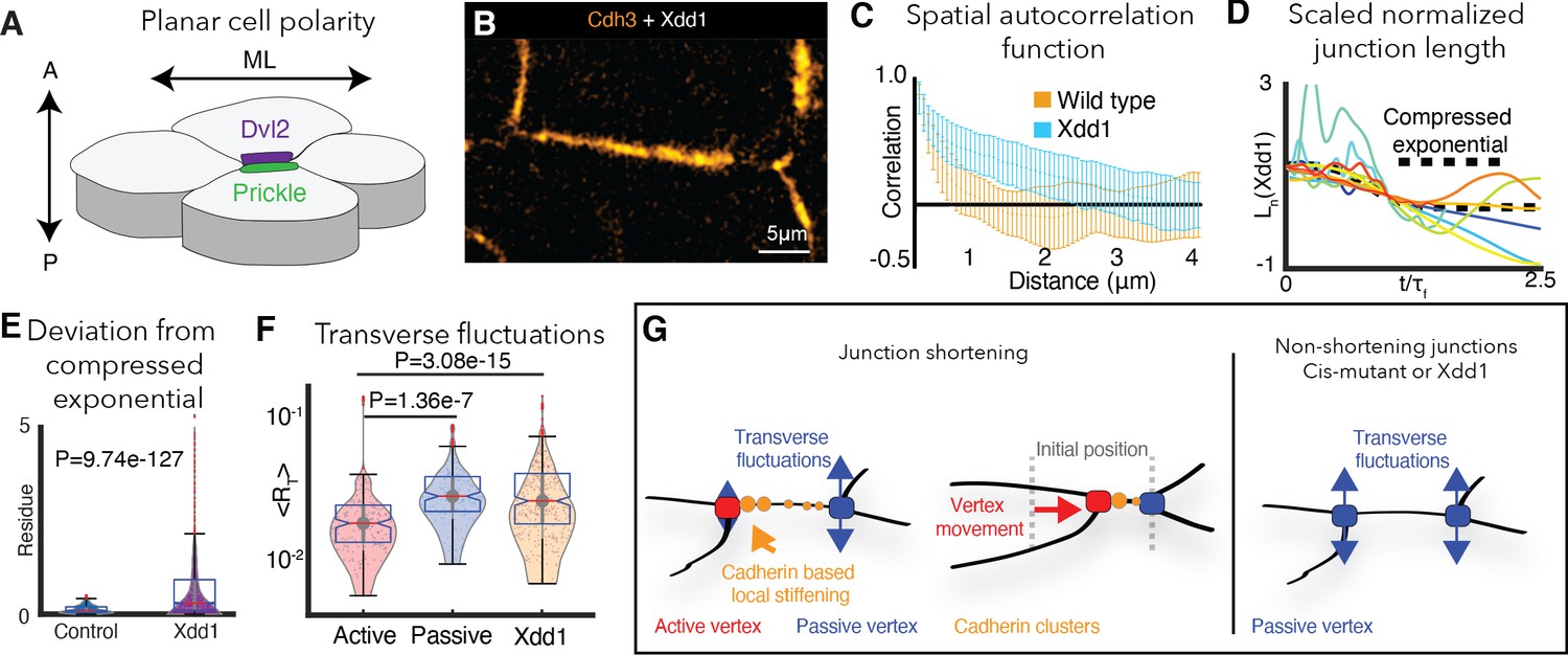 Figure 7. PCP is required for cdh3 cis-clustering and heterogeneous junction mechanics.(A) Cartoon of polarized core PCP protein localization. (B) Still image of Cdh3-GFP after expression of dominant negative Dvl2 (Xdd1). (C) Spatial autocorrelation of Cdh3 intensity fluctuations for Xdd1 (53 image frames, 5 embryos) and control embryos (60 frames, from 10 embryos),± std. dev. The spatial organization of Xdd1 mutant cadherin is similar to cisMut-Cdh3 expressing embryos. (D) Normalized junction length dynamics for Xdd1 embryos. Dashed black line indicates the normal compressed exponential behavior. (E) Residue for the deviation from the universal compressed exponential function for Xdd1 junctions. (F) Plots for transverse fluctuations at active and passive vertices compared to Xdd1-expressing vertices. (Note: Data for active and passive junctions are re-presented from Figure 3C for comparison to Xdd1.) (G) Schematic summarizing the primary conclusions. |