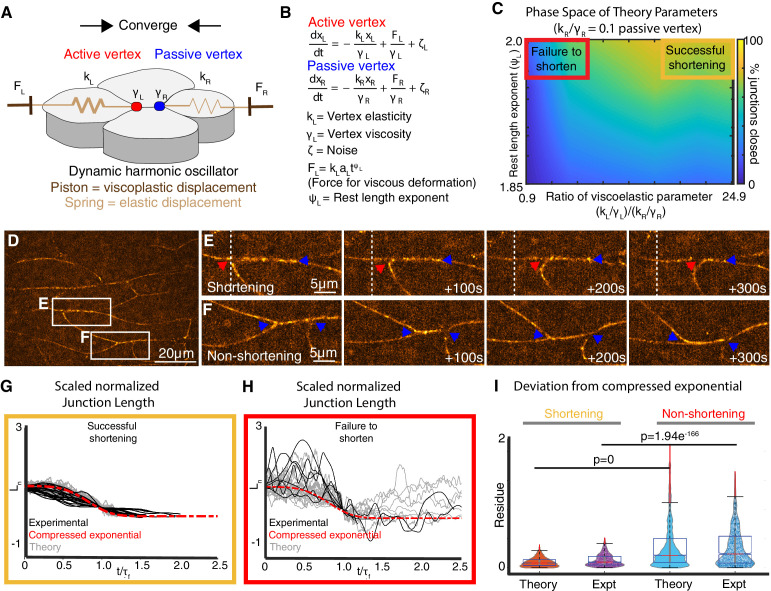 Figure 2. A new vertex model incorporating local mechanical heterogeneity recapitulates the fine-scale dynamics of junction shortening observed in vivo.(A) Sketch of v- junction shortening with elements of the model overlain. Active (red) and passive (blue) vertex movements are affected by a piston modulating the dynamic rest length. The vertices execute elastic motion due to springs of elasticity, kL and kR. L,R indices indicate left and right. The thicker spring indicates a stiffer elasticity constant, kL. (B) Equations of motion for active and passive vertex positions, xL and xR. Displacement of the left (right) vertex due to the piston is determined by the forces FL(FR) whose time dependence is determined by the rest length exponent,ψLψR. The friction experienced by the left (right) vertices are modeled using γLγR. ζL is the colored noise term for the left vertex (Appendix, Section 4-6). (C) Heatmap indicating probability of successful junction shortening (legend at right) in parameter space for the viscoelastic parameter near vertices and the rest length exponent, staying within biologically reasonable values based on data from Drosophila (Solon et al., 2009; Appendix, Section 6). (D) Still image from a time-lapse of Xenopus CE. Insets indicate representative shortening and non-shortening junctions shown in Panels E and F (vertices indicated by arrowheads). (G) Normalized change in length, Ln, for shortening junctions in vivo (black lines) and in simulations using asymmetric viscoelastic parameters (gray lines) resembling the compressed exponential form (red, dashed line) after the time axis is rescaled. (H) Normalized change in length, Ln, for non-shortening junctions in vivo (black lines) and in simulations using symmetrical viscoelastic parameters (gray lines). (I) Quantification of relaxation behavior deviation from the compressed exponential using the residue (Appendix, Section 8-10). |