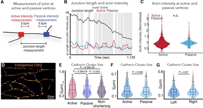 Figure 4—figure supplement 1 Extended analysis pertaining to cdh3 clustering and actin next to junctions (Appendix, Section 16). (A) Schematic showing how actin was measured next to active and passive vertices at shortening v-junctions. (B) Graph showing junction length and actin intensities over time for a single shortening junction. The black line is junction length, red is actin intensity next to the active vertex, and blue is actin intensity next to the passive vertex. (C) Graph showing normalized actin intensity next to active (red) or passive vertices. Intensity was normalized to account for expression by dividing each datapoint by the mean intensity of the dataset. Conditions were statistically compared using a t-test. (D) Immunostaining for endogenous Cdh3 showing that the endogenous protein forms cadherin cis-clusters. (E) Violin plot of Cdh3 cluster sizes next to active vertices (red), passive vertices (blue), and non-shortening left and right vertices (black) for all frames including shortening and non-shortening events. Statistical significance was assessed using a Kolmogorov-Smirnov test. (F) An alternative definition of cluster size was used to analyze differences in cadherin clustering. By fitting an exponential function to the spatial autocorrelation of cadherin intensity fluctuation, we extract the characteristic cadherin cluster size. Violin plot shows the Cdh3 cluster sizes for active versus passive vertices in shortening junctions. 1538 frames from 10 embryos were analyzed. Kolmogorov-Smirnov shows significant differences between Cdh3 clustering near active versus passive vertices (p=0.004). (G) Violin plot of Cdh3 cluster sizes for left versus right vertices in non-shortening junctions. A total of 2062 frames from seven embryos were analyzed. Kolmogorov-Smirnov did not indicate significant differences between Cdh3 clustering near left versus right vertices (p=0.07). |