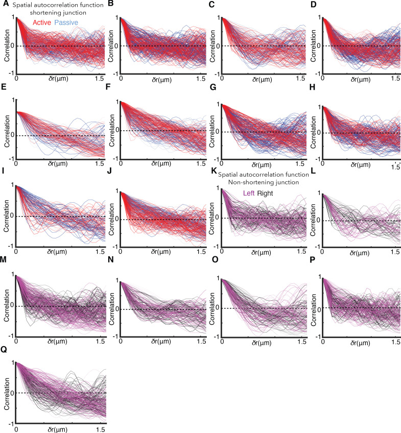 Figure 4—figure supplement 2. Source data for spatial correlation of Cdh3 intensity fluctuations reveal extreme heterogeneity in cluster size.(A-J) Individual (time frame by frame) spatial correlation vs distance curves selecting for shortening events from 10 distinct cell-cell junctions that undergo successful junction shortening (Appendix, Section 16). Cadherin spatial correlation near active (passive) vertices are shown in red (blue) lines. (K-Q) Individual (time frame by frame) spatial correlation vs distance curves from seven distinct cell-cell junctions that do not successfully shorten. Cadherin spatial correlation near left (right) vertices are shown in magenta (black) lines (Appendix, Section 16). |