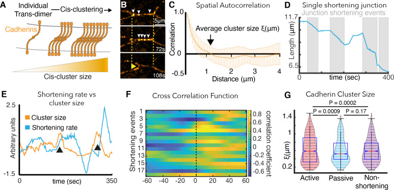 Figure 4. Cadherin cis-clustering correlates with vertex movements and mirrors asymmetric vertex dynamics.(A) C-cadherin (Cdh3) cis-clustering; trans-dimers form across opposing cell membranes (gray); lateral cis interactions drive clustering. (B) Frames from time-lapse of Cdh3-GFP; white arrows highlight clusters. Dashed lines denote initial vertex positions; yellow arrow indicates junction shortening. (C) Spatial autocorrelation of Cdh3 intensity fluctuations (SI Section 13)(60 image frames, 10 embryos). Autocorrelation decays to zero at ~1 μm. Error bars are standard deviation. (D) Trace from a single v-junction displaying pulsatile shortening highlighted by gray boxes (E) Junction length and Cdh3 cluster size fluctuations for an individual cell-cell junction. Cadherin cluster size fluctuations peak prior to junction shortening events (Appendix, Section 14,15). (F) Heat map showing cross correlation between junction length and Cdh3 cluster size. Color represents the value of the correlation coefficient (legend at right). Dashed black line indicates zero lag time. (Appendix, Section 14,15)(n = 11 junctions and 18 shortening events.) (G) Cadherin cluster size as extracted from spatial correlation curves (Figure 4—figure supplement 2; Appendix, Section 16). Cadherin cluster sizes are significantly larger near active vertices. Clusters near vertices of non-shortening junctions are not significantly different from those near passive vertices. |