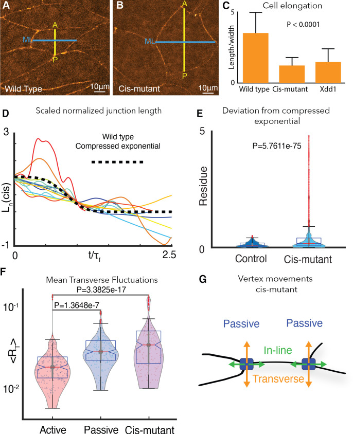 Figure 6 Cdh3 cis-clustering is required for heterogeneous junction mechanics. (A) Image of polarized, elongated control Xenopus mesoderm cells. Blue = mediolateral (ML); yellow = anterior-posterior (AP). (B) Stage-matched cells after depletion of endogenous Cdh3 and re-expression of cisMut-Cdh3. (C) Cellular length/width ratio to quantify CE cell behaviors (p value indicates ANOVA result). (D) Normalized junction length dynamics (Ln ) for cis-mutant expressing junctions. Large fluctuations here are similar to those seen normally in non-shortening junctions (see Figure 2H). Dashed black line indicates the expected compressed exponential. (E) The residue quantifying significant Ln deviation from the compressed exponential function as compared to control junctions. (F) Plots for transverse fluctuations ⟨RT⟩ , for control active and passive vertices compared to cis-mutant vertices. (Note: Data for active and passive junctions are re-presented from Figure 3C for comparison.) (G) Schematic illustrating symmetrical vertex behavior after disruption of cdh3 cis-clustering. |