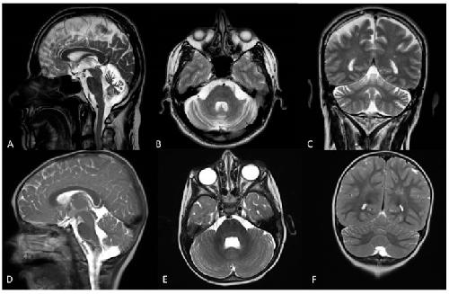 Figure 1. Brain MRI of patient 1 performed at 57 years old. T1-weighted midsagittal (A) axial (B) and coronal (C) sections showing atrophy of the cerebellar vermis and hemispheres. Brain MRI of patient 2 performed at age 2 years. T1-weighted midsagittal (D) axial (E) and coronal (F) sections showing mild atrophy of the superior cerebellar vermis and hemispheres.