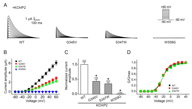 Figure 3. Loss-of-function channel phenotype of disease-related KV4.3 mutants. Functional expression of Myc-KV4.3 channel subunits in the presence of the auxiliary KChIP2 subunit in Xenopus oocytes. (A) Representative current traces in response to a voltage protocol comprising test potentials ranging from -60 mV to +60 mV in 10-mV steps. In contrast to the robust K+ currents observed in the WT, expression of individual KV4.3 p.G345V, p.S347W, and p.W359G mutant resulted in significant reduction in outward K+ currents. (B) Peak K+ current amplitudes are plotted against corresponding test pulse potentials (I-V curves). (C) Normalized peak current amplitudes at +60 mV: WT, 1.00 ± 0.10; p.G345V, 0.45 ± 0.05; p.S347W, 0.39 ± 0.05; p.W359G, 0.00 ± 0.00. Data from the same batch of oocytes on a given day were normalized with respect to the mean amplitude of the WT, followed by pooling multiple normalized data from different batches of oocytes. Numbers of observations are labeled in parentheses. Asterisks denote significant differences from the WT control (*, p < 0.05). (D) Steady-state activation curves of individual WT, p.G345V, and p.S347W KV4.3. Lines represent Boltzmann equation fits to the data points. The half-activation voltage (V0.5a) are: WT, −28.9 ± 0.5; p.G345V, −28.9 ± 0.5; p.S347W, −28.9 ± 0.5.