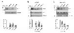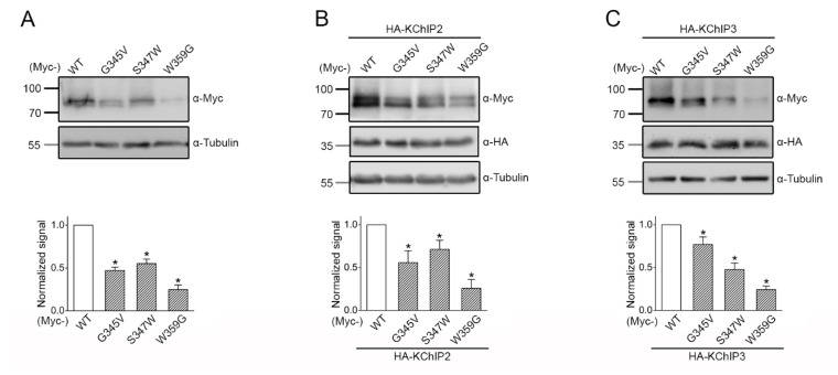 Figure 4. Disrupted proteostasis of the disease-associated KV4.3 mutants. Biochemical characterization of Myc-KV4.3 subunits in HEK293T cells. (Top panels) Representative immunoblots showing total protein expression of various KV4.3 constructs. Cell lysates were subject to immunoblotting analyses with the indicated antibodies (α-Myc, α-HA, and α-Tubulin). Molecular weight markers (in kDa) are labeled to the left. Tubulin expression was chosen as the loading control. (Bottom panels) Statistical analyses. Total KV4.3 protein density was standardized as the ratio to the cognate total tubulin signal, followed by normalization with respect to the WT control. (A) Myc-KV4.3 subunits were expressed alone (n = 6): WT, 1.00 ± 0.08; p.G345V, 0.47 ± 0.04; p.S347W, 0.55 ± 0.05; p.W359G, 0.25 ± 0.05. (B) Myc-KV4.3 were co-expressed with HA-KChIP2 (n = 6): WT, 1.00 ± 0.10; p.G345V, 0.56 ± 0.14; p.S347W, 0.71 ± 0.11; p.W359G, 0.26 ± 0.10. (C) Myc-KV4.3 were co-expressed with HA-KChIP3 (n = 14−18): WT, 1.00 ± 0.03; p.G345V, 0.77 ± 0.09; p.S347W, 0.48 ± 0.08; p.W359G, 0.24 ± 0.04. Asterisks denote significant difference from the WT control (*, p < 0.05).