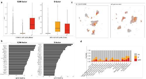 Figure S2: Detection and removal of the cell cycle signature. (a) Unbiased factor analysis identified two factors that correspond to computationally-inferred cell cycle phases (G2M-factor, left; S-factor, right). (b) Factor loadings for the top 30 genes associated with cell cycle factors. (c) Removal of genes with high loadings for either G2M- or S-factors significantly reduces the influence of cell cycle phase on the UMAP projection. Dot color indicates inferred cell cycle phase. (d) Inferred cell cycle states for selected cell types. |