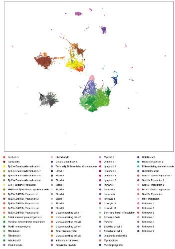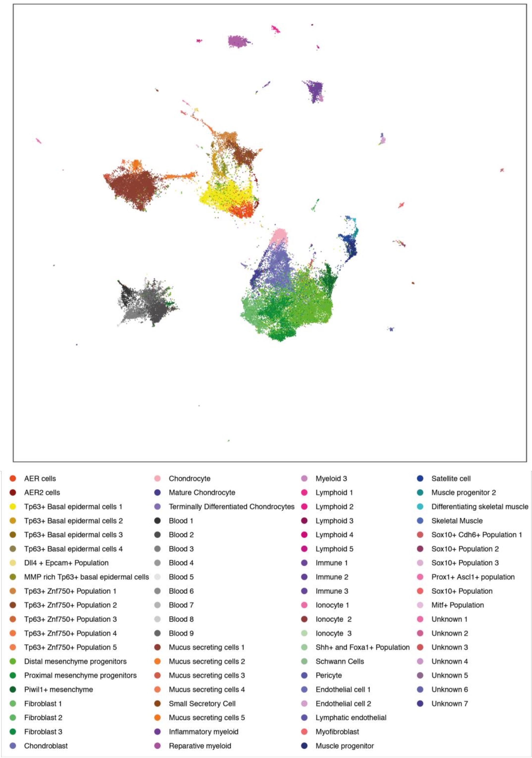 Figure S3: An atlas of cell types in developing and amputated limbs at different stages of regeneration-competence. Pooled UMAP visualization of Xenopus limb cells, with colors representing distinct cluster identities |