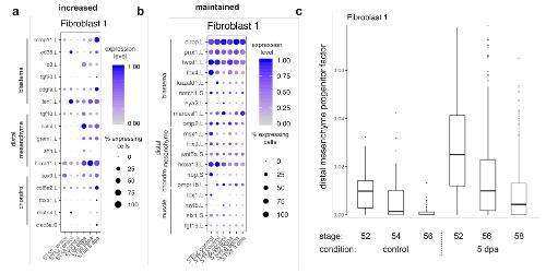 Figure S10: A subset of fibroblasts express dedifferentiation and blastema genes independently of the regeneration-outcome. Expression of genes and putative gene sets associated with regeneration in the Fibroblast 1 cluster, visualized using dotplots and factor analysis. (a) Expression of specific genes that increase upon amputation regardless of stage. (b) Expression of specific genes that are expressed in intact limbs and are maintained after injury. (c) Following amputation, the putative distal mesenchyme progenitor gene set (factor) increases in Fibroblast 1 cells across all stages. |