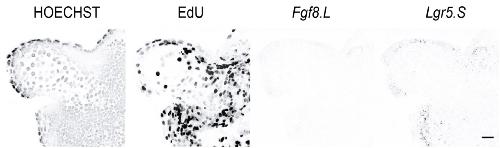 Figure S8: AER cells can be mono- or multi-layered structures. Fgf8.L images of sectioned in vivo 5 dpa samples from regeneration âcompetent (top) and â restricted (bottom) samples. Morphology of AER cells (Fgf8.L+) can vary between sections and samples. Top left, AER cells are seen as single monolayer largely cuboidal although some have higher height to width ratio. Top right, AER cells are seen as single monolayer largely cuboidal cells. Bottom left, AER cells can be seen as multi-layered population that is not covering the whole amputation plane. Bottom right, AER cells can be seen as multi-layered population covering the amputation plane. Blue, Hoechst; Green, Fgf8.L mRNA. Scale bars = 25 μm. |