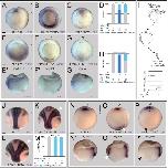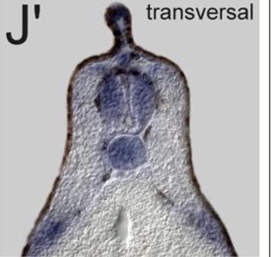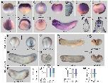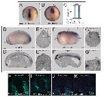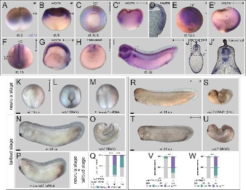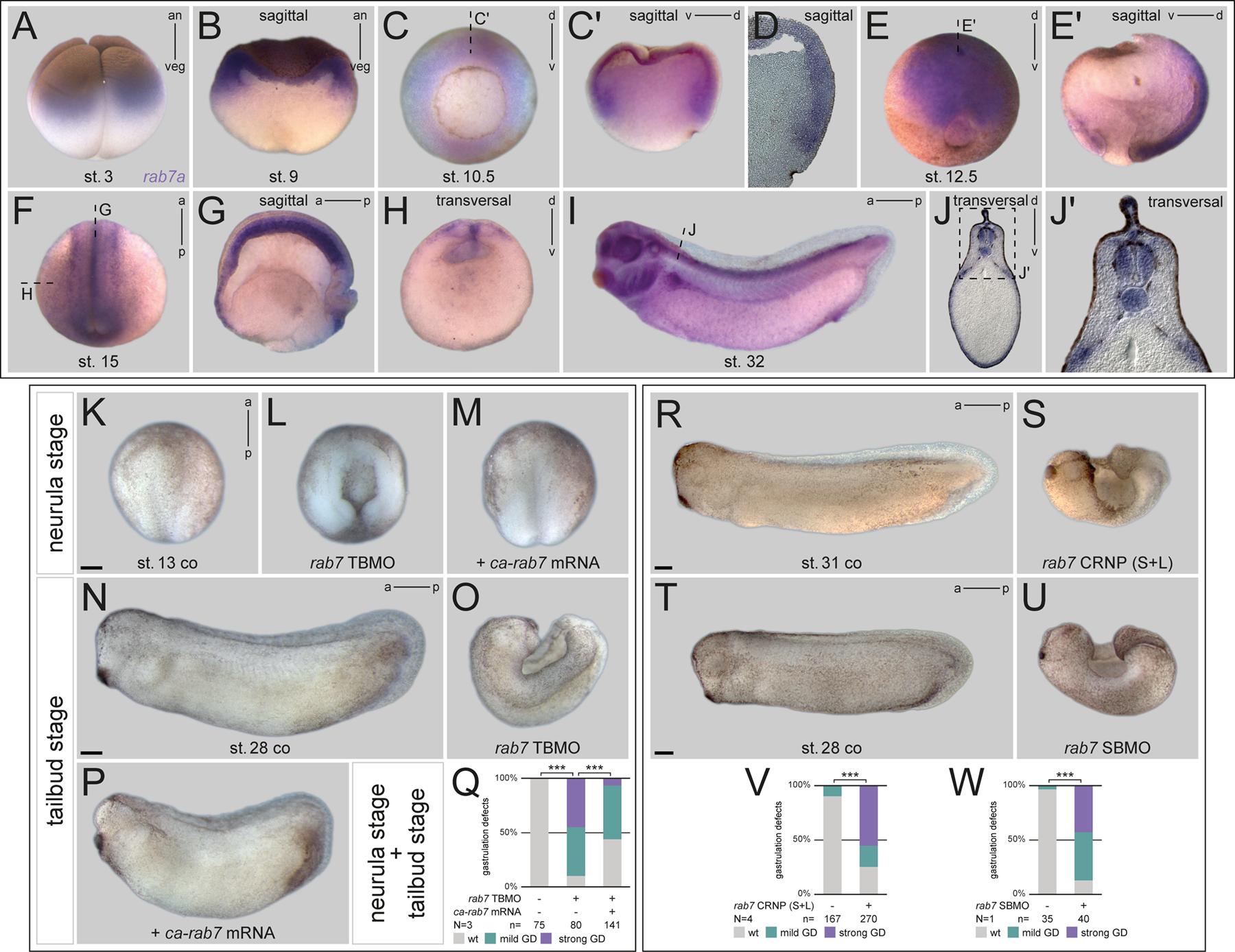 Fig. 1. rab7 shows dynamic expression and inhibition resulted in gastrulation defects. (A,B) Expression of rab7 mRNA in animal hemisphere at stage 3 and sagittal section of late blastula stage. (C) Upon gastrulation transcripts were enriched in deep mesodermal ring, (Câ²) sagittal section as indicated in (C), (D) dorsal area close-up view of a vibratome-sectioned specimen. (E) At stage 12.5 rab7 accumulates in neural plate ectoderm, (Eâ²) sagittal section of E. (F) During neurulation transcripts get restricted to notochord, neural tube and brain tissue, (G) sagittal and (H) transversal section indicated in F. (I) In tailbud stages transcripts were detected in the notochord and pronephric and head tissues, (J) transversal section indicated in I, (Jâ²) enlargement of J. (K,N) Control specimen at stages 13 and 28. (L,O) Injection of rab7 TBMO in dorsal lineage caused gastrulation defects, resulting in severe dorsal phenotypes. (M,P) Co-injection of ca-rab7 mRNA rescued loss of function phenotype of morphant embryos. (Q) Quantification of results in KâP. (R,T) Tailbud control embryos, (S,U) siblings treated with rab7 CRNP (S+L) or rab7 SBMO showing dorsal phenotypes. (V,W) Quantification of results in (R,S and T,U). a, anterior; an, animal; ca, constitutive active; co, control; CRNP, Cas9 Ribonucleoprotein; d, dorsal; GD, gastrulation defect; p, posterior; SBMO, splice blocking Morpholino Oligonucleotide; st., stage; TBMO, translation blocking Morpholino Oligonucleotide; v, ventral; veg, vegetal; wt, wild type. Scale bars: 250â µm. |