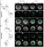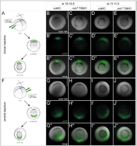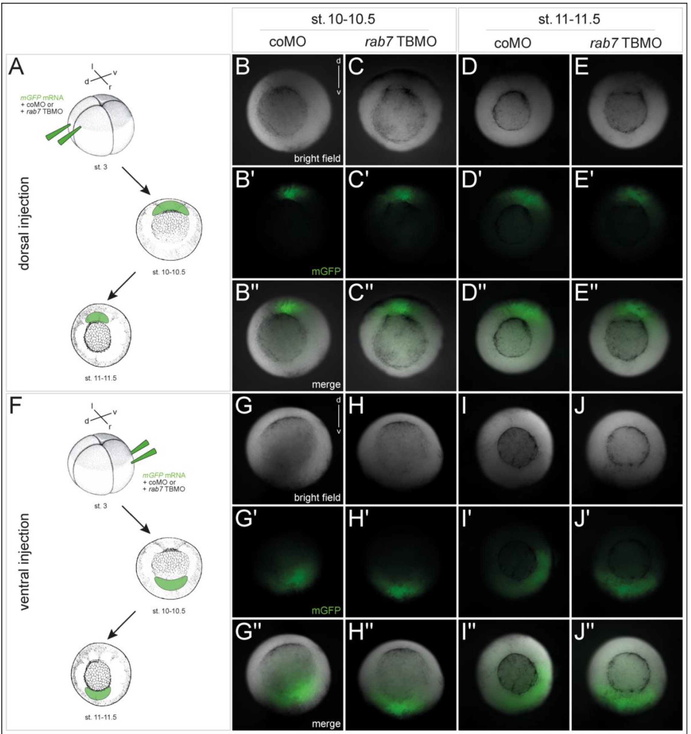 Fig. S3. Lineage-specific knockdown of rab7 in the dorsal or ventral mesoderm. (A,F) Lineage tracing scheme of injection site (dorsal or ventral) in st. 3 embryos; tested st. 10-10.5 illustrates observed localization of injected material at correct target side (dorsal or ventral), and approximately one stage later before fixation (for late gastrula analyses). mGFP mRNA lineage tracer was co-injected with coMO (B,D,G,I) or rab7 TBMO (C,E,H,J), correct targeting and corresponding phenotypes visualized via fluorescent mGFP (B'-E',G'-J'), brightfield (B-E,G-J) and merged channels (B''-E'',G''-J''). coMO injected specimen depicted normal gastrulation at st. 10- 10.5 and 11-11.5, both, when injected dorsally (B,D) or ventrally (G,I). (C,E) Impaired dorsal lip formation of rab7 morphant embryos at onset of gastrulation, with increasing severeness during gastrulation. (H) Ventral injected specimen did not show altered tissue at st. 10-10.5, (J) impaired lip formation at later gastrula stages with diffuse appearance of ventral lip. coMO, control Morpholino Oligonucleotide; d, dorsal; p, posterior; st., stage; TBMO, translation blocking Morpholino Oligonucleotide; v, ventral; veg, vegetal. |