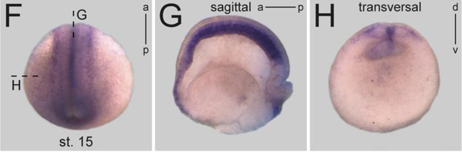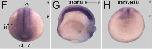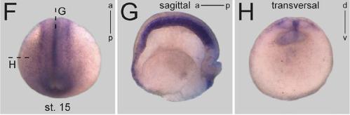 rab7a (RAB7A, member RAS oncogene family) gene expression in X. laevis embryo NF stage 15, assayed via in situ hybridization, anterior view, dorsal up (F) , and in sagittal section (G) with posterior right, and in transverse section (H) with dorsal up. |