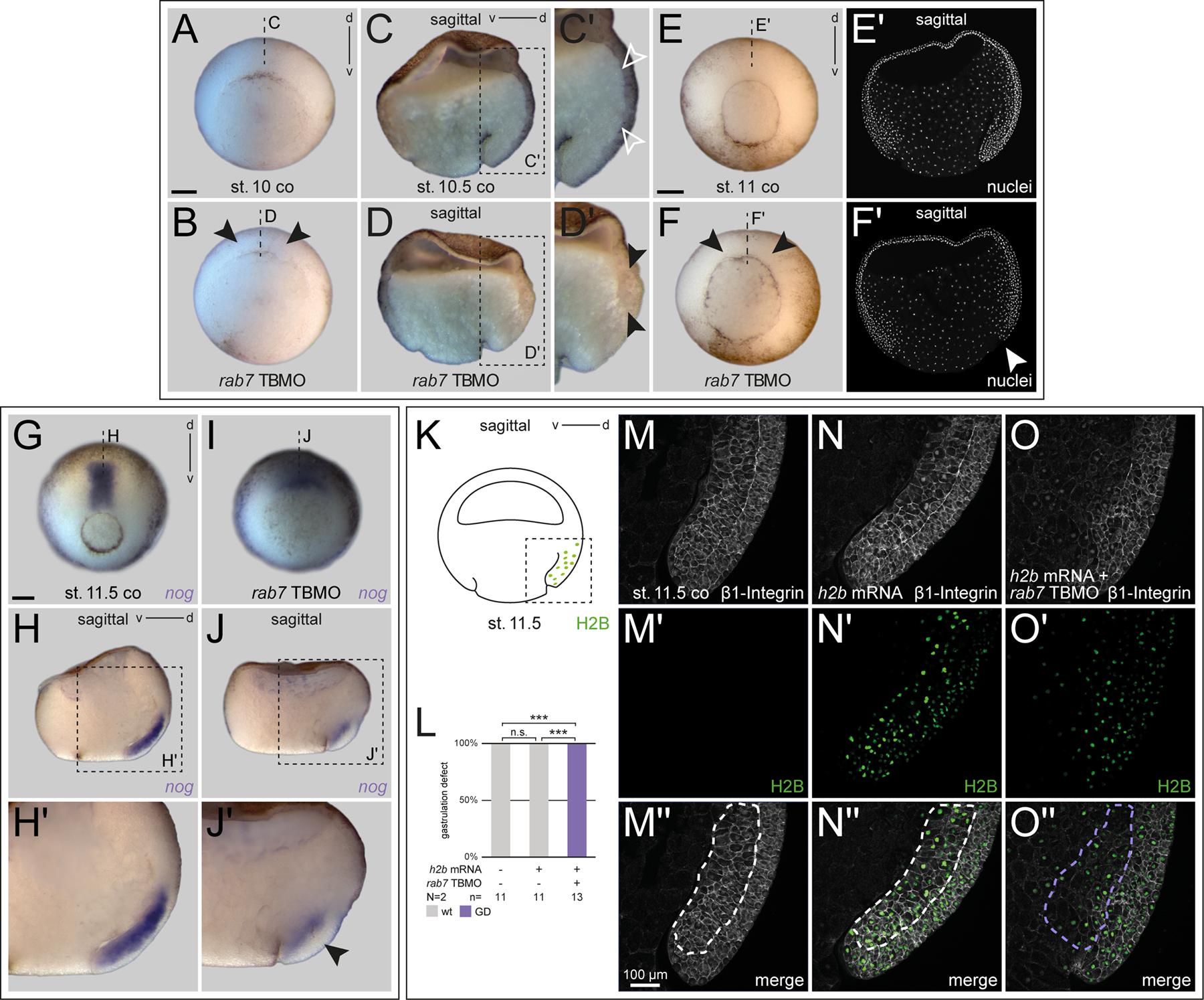 Fig. 2. rab7 morphants show impaired dorsal lip formation. (A) Untreated embryos at the beginning of gastrulation forming a dorsal lip, (B) which can also be observed in rab7 deficient siblings (black arrowheads). (C) In stage 10.5, sagittal sectioned control embryos revealed early involution movements. (Câ²) Enlargement of the area in the dashed black box in C, showing formation of Brachet's cleft was visible (white outlined arrowheads), (D) dorsal rab7 knockdown specimen rarely showed involution in sagittal sections or Brachet's cleft formation, (Dâ²) enlargement of the area in the dashed black box in D, (black arrowheads). (E) Older control embryo (mid-gastrula) with evenly shaped lip, (Eâ²) sagittal section with Hoechst stained nuclei revealed proceeded dorsal involution and archenteron formation. (F) Same-age morphant siblings developed irregularly shaped lips around the blastopore (black arrowheads), and (Fâ²) did not show any involuting tissue or archenteron formation in Hoechst stained sagittal section (white arrowhead). (G) Wild-type nog expression of control embryos and (I) reduced expression of nog and concomitant failed notochord elongation of dorsal rab7 morphants. (H) Sagittal section and (Hâ², enlargement of the area in the dashed black box in H) exhibited proceeded notochord elongation marked by nog in untreated embryos. (J) Sagittal section and (Jâ²) enlargement of the area in the dashed black box in J clearly depicted impaired nog expression (black arrowhead). (K) Schematic figure of sagittally bisected mid- to late gastrula embryo indicating view of dorsal lips shown in M-Oâ³. (L) Quantification of overall embryonic phenotypes exemplified in M-Oâ³. (M,N,O) bisected embryos stained for β1-Integrin (white). (Mâ²,Nâ²,Oâ²) Histon 2B (H2B) GFP signal used as lineage tracer (green), (Mâ³,Nâ³,Oâ³) merged channels. (M,N) Normal distributed β1-Integrin in wild-type dorsal lips or h2b mRNA-injected specimen, indicating target site. (O) Axial rab7 morphant cells revealed altered shapes and lack of involution behavior and archenteron formation. Scale bars: A-Jâ², 250â µm; M-Oâ³, 100â µm. |