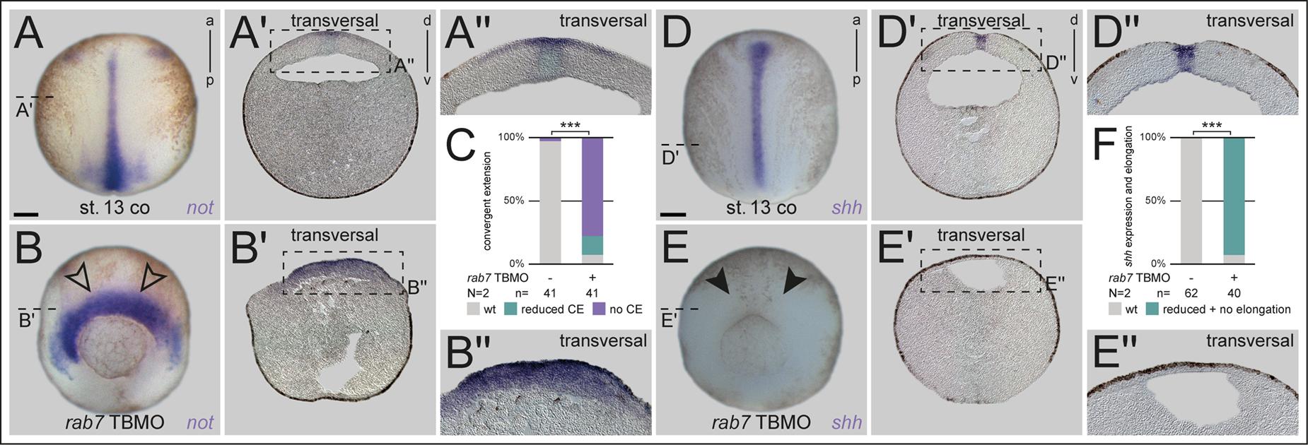 Fig. 3. rab7 is required for axial elongation and notochord morphogenesis. (A,D) Early wild-type neurula embryos showing elongated notochords marked by the expression of not or shh. (Aâ²,Dâ²) Transversal sections indicated in (A,D) revealed not and shh expression in the axial neural plate and shh additionally throughout the whole notochord. (Aâ³,Dâ³) enlargement of the area in the dashed black boxes in Aâ² and Dâ², respectively. (B,E) Dorsal rab7 TBMO injection resulted in embryos failing to elongate their notochord, although not expression intensity (black outlined arrowheads) was not reduced in comparison to shh (black arrowheads). (Bâ²) Transversal section of morphant embryos showed lateral expanded expression of not above the dorsal lip and (Eâ²) severely reduced shh expression. (Bâ³,Eâ³) enlargement of the area in the dashed black boxes in Bâ² and Eâ², respectively. (C,F) Quantification of results in A,B and D,E, respectively. Scale bars: 250â µm. |