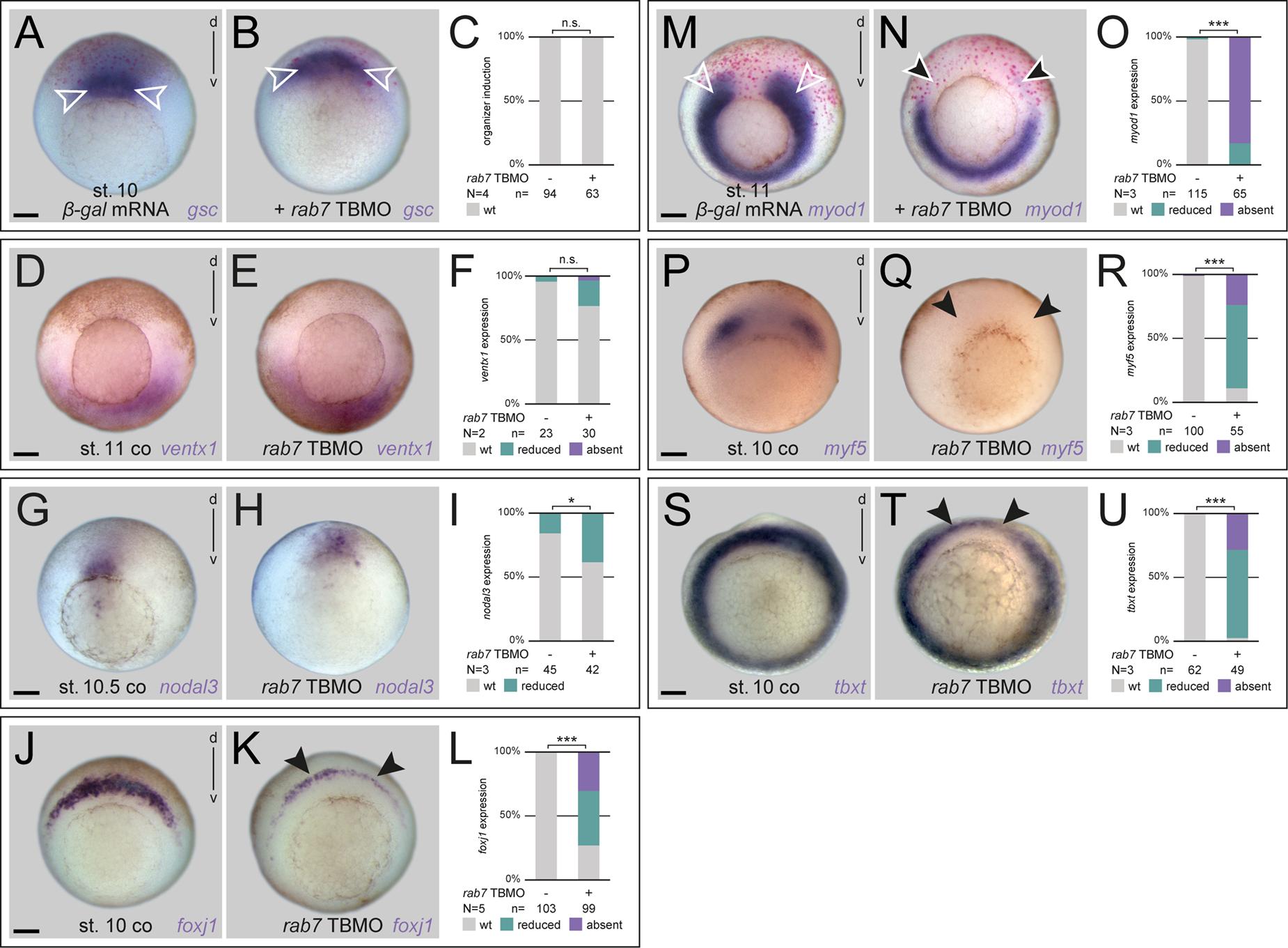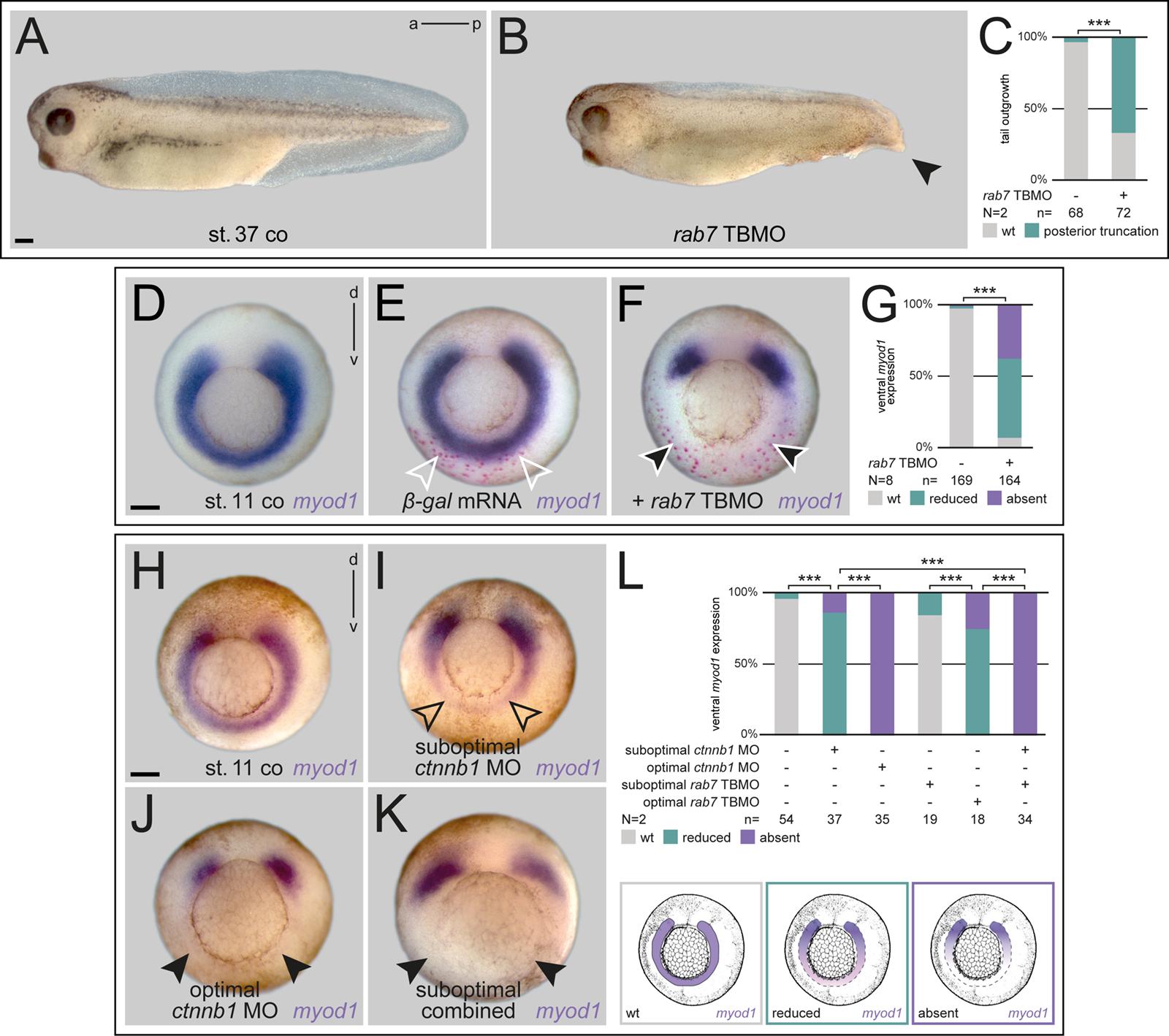 Fig. 5. Specification of the ventral mesoderm requires Rab7. (A) Untreated early tadpoles with normal tail development, which was impaired by rab7 loss of function in ventral lineage resulting in posterior truncations (B, black arrowhead). (C) Quantification of results in A,B. (D) Mid-gastrula control embryo depicting wild-type myod1 expression, (E) injected β-gal mRNA marks ventrally targeted area (outlined white arrowheads). (F) Co-injection of β-gal mRNA and rab7 TBMO revealed reduced or absent ventral myod1 expression in most specimen at corresponding target site (white outlined black arrowheads). (G) Quantification of results in D-F. (H) Ventro-lateral mesoderm shown by wild-type myod1 expression. (I) Ventral injection of suboptimal doses of ctnnb1 MO resulted in minor reduction of myod1 (black outlined arrowheads), (J) whereas optimal doses caused complete loss of ventro-lateral expression (black arrowheads). (K) Parallel injection of rab7 TBMO and ctnnb1 MO, both in suboptimal doses, lead to absence of myod1 (black arrowheads). (L) Quantification of epistatic function of Rab7 and Ctnnb1 in ventro-lateral mesoderm, different manifestations of myod1 expression exemplified below. Scale bars: 250â µm. |
