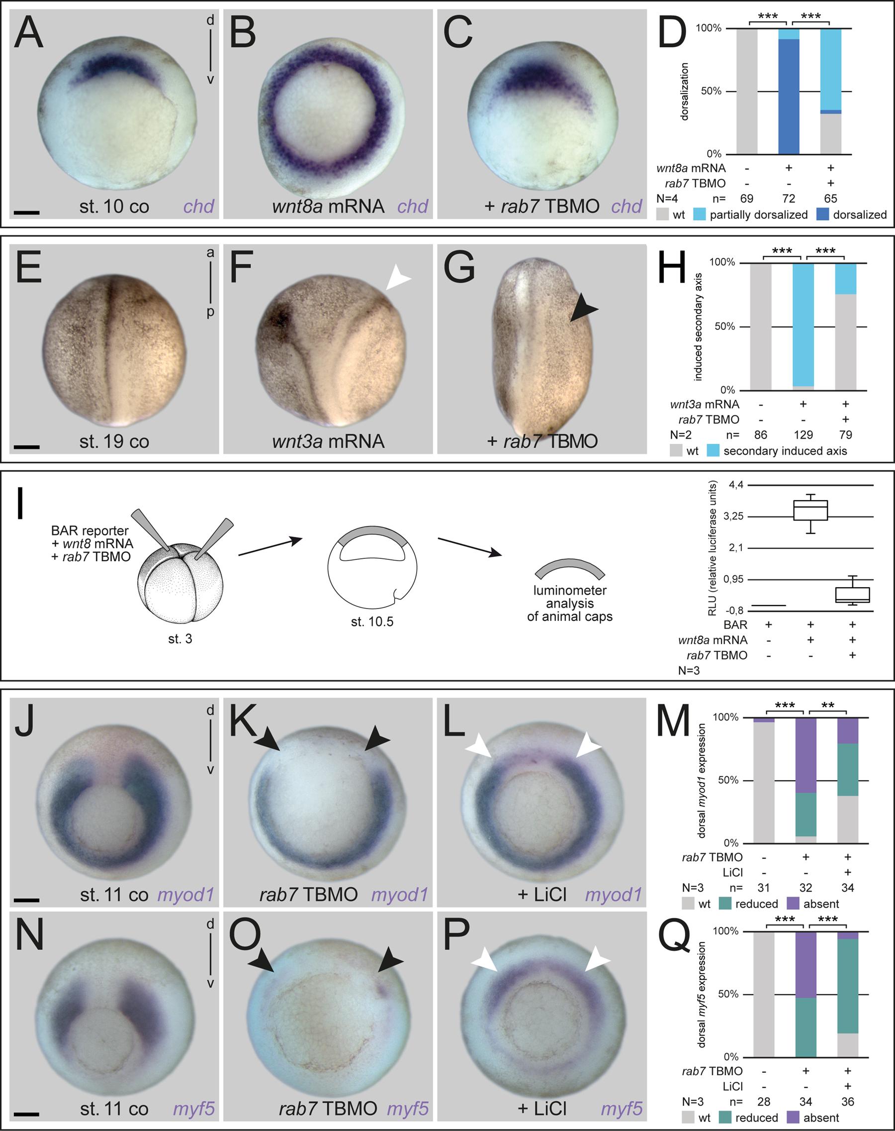 Fig. 7. Rab7 is required for canonical Wnt pathway activation. (A) Wild-type dorsal expression of chd in comparison to specimen with (B) radial injected wnt8a mRNA showing an extended chd expression domain around the blastopore. (C) Co-injection of rab7 TBMO restricted additional chd expression to normal wild-type state. (D) Quantification of results in A-C. (E) Untreated control specimen, (F) in comparison to induced double axis (white arrowhead) after ventral wnt3a mRNA injection, (G) parallel injection of rab7 TBMO inhibited secondary axis formation (black arrowhead). (H) Quantification of results in E-G. (I) Luciferase-based Wnt reporter assay analysis at stage 10.5 illustrated that wnt8a induced reporter activity was blocked by rab7 loss of function in animal caps. (J,N) Wild-type expression of myod1 and myf5 in stage 11 control embryos. (K,O) Absent dorsal myod1 expression and lost domains upon rab7 loss of function (black arrowheads). (L,P) Treatment with LiCl partially rescues dorsal expression of myod1 and myf5 in rab7 morphant embryos (white arrowheads). Please note that LiCl-induced ectopic expression in the axial mesoderm was not inhibited by the rab7 TBMO. (M,Q) Quantification of results in J-L and N-P, respectively. Scale bars: 250â µm. |