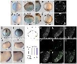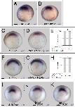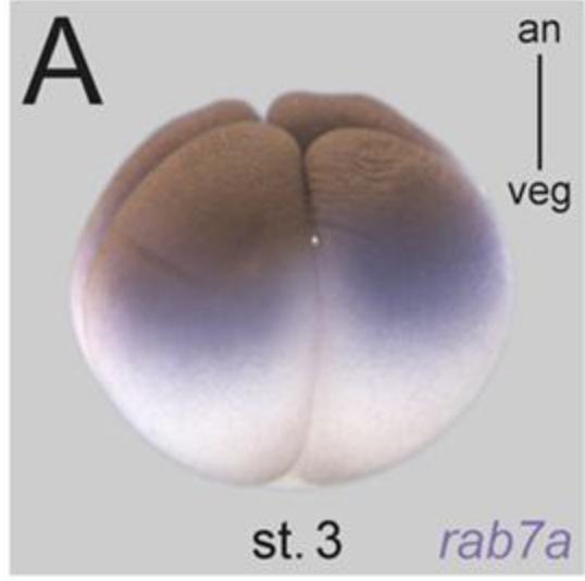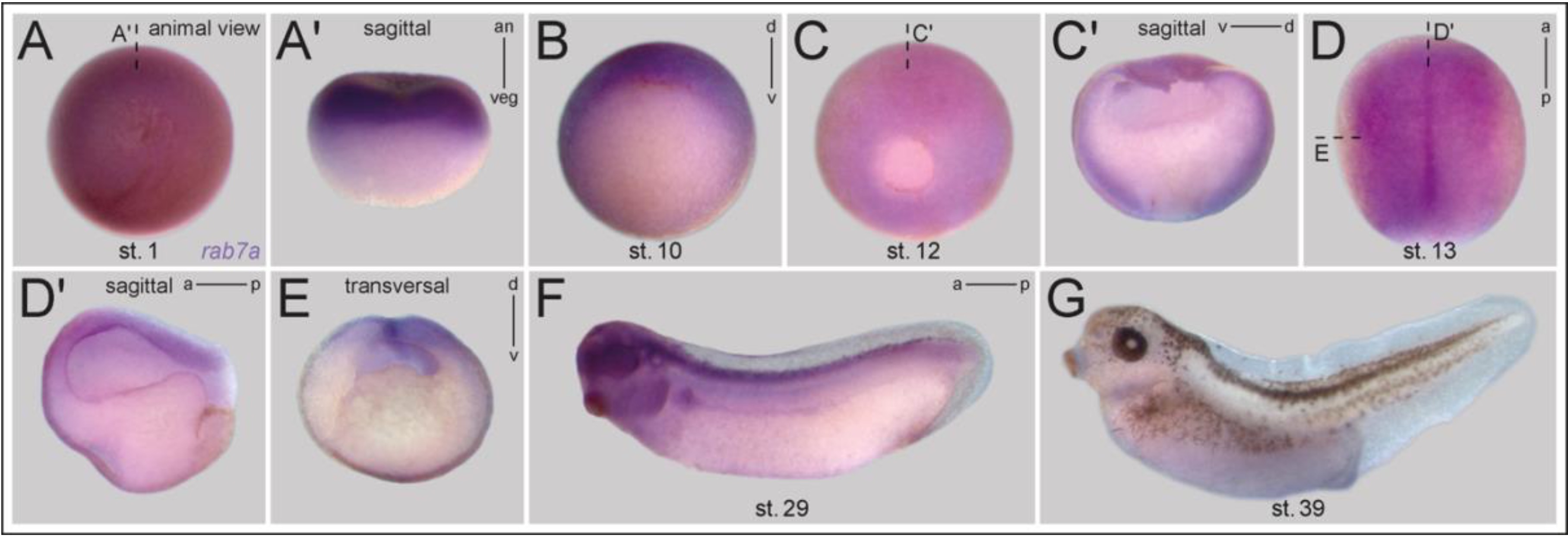 Fig. S1. rab7 exhibits dynamic expression pattern. (A) rab7 expression in animal hemisphere of st. 1 embryo, (A') sagittal section of (A). (B,C) Early and late gastrula stages displayed transcripts in deep mesoderm, (C') sagittal section of (C). (D) Onset of neurulation with rab7 restricted to neural plate and notochord, (D') sagittal section of (D), (E) transversal section as indicated in (D). (F,G) Tailbud stage expression in the notochord, trunk neural crest, eyes, pronephric and head tissues and in dorsal fin mesenchyme. a, anterior; an, animal; d, dorsal; p, posterior; st., stage; v, ventral; veg, vegetal. |