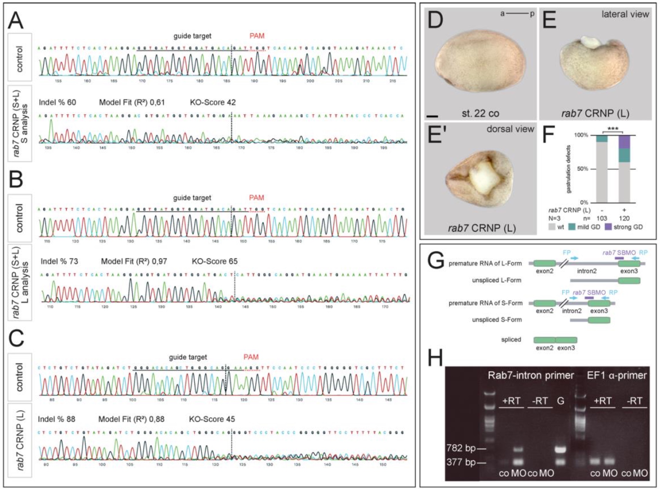 Fig. S2. Loss of rab7 caused gastrulation and axis elongation defects. (A-C) Synthego ICE CRISPR analysis of rab7 sgRNAs targeting both S and L alleles or L alone. (D) Wildtype control embryo compared to lateral view of rab7 CRNP (E) treated specimen with severe gastrulation defects, (E') dorsal view. (F) Quantification of results in (D-E). (G) Scheme of binding sites of rab7 SBMO targeting both homeologs. (H) RT-PCR of knockdown by rab7 SBMO demonstrated successful inhibition of splicing. |