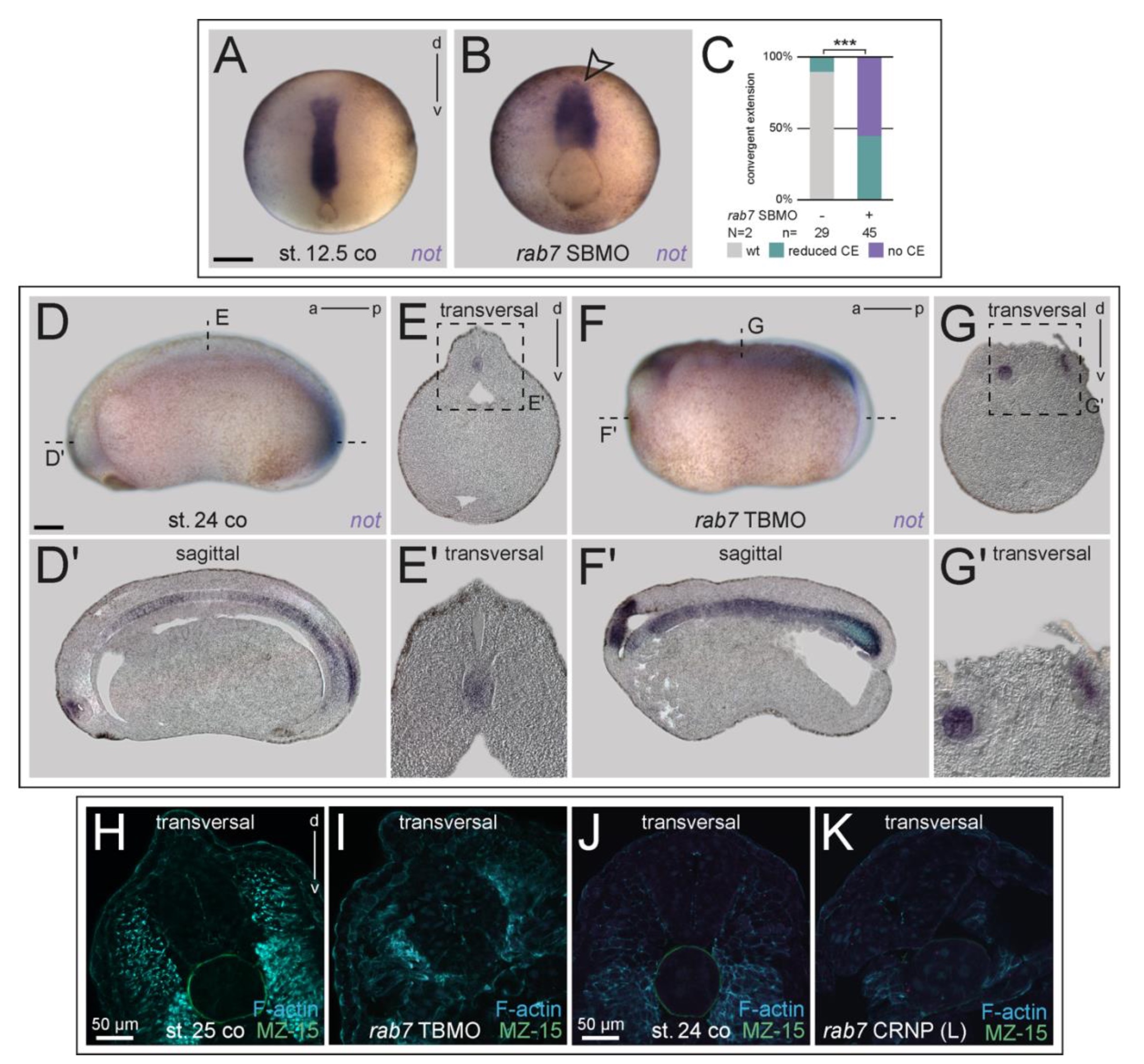 Fig. S4. rab7-deficient embryos develop axial elongation defects and impaired notochord morphogenesis. (A) Elongated notochords of control embryos highlighted by not expression (B) in comparison to dorsal rab7 SBMO injection, which resulted in reduced notochord elongation (arrowhead). (C) Quantification of results in (A-B). (D) Tailbud stage embryos revealed not expression throughout the notochord, (D') also shown in sagittal and (E) transversal section and (E') blow-up of (E). (F) rab7 knockdown in dorsal lineage did not reduce not expression, (F') but affected notochord morphogenesis depicted in thicker notochord as shown in sagittal section. (G) Transversal sections revealed some morphant specimen also developed split notochords, (G') blow-up highlighting open dorsal tissue. (H-K) Transversal sections of st. 24/25 embryos stained for F-Actin (blue) and MZ- 15 (green). (H,J) control specimen displayed wildtype outer sheets of notochords (green), (I) MZ- 15 staining was absent in rab7 TBMO injected or (K) reduced in rab7 CRNP treated embryos. Scale bars: (A-G) 250μm; (H-K) 50μm a, anterior; CE, convergent extension; co, control; CRNP, Cas9 Ribonucleoprotein; d, dorsal; n.s., not significant; p, posterior; st., stage; v, ventral; wt, wildtype. |