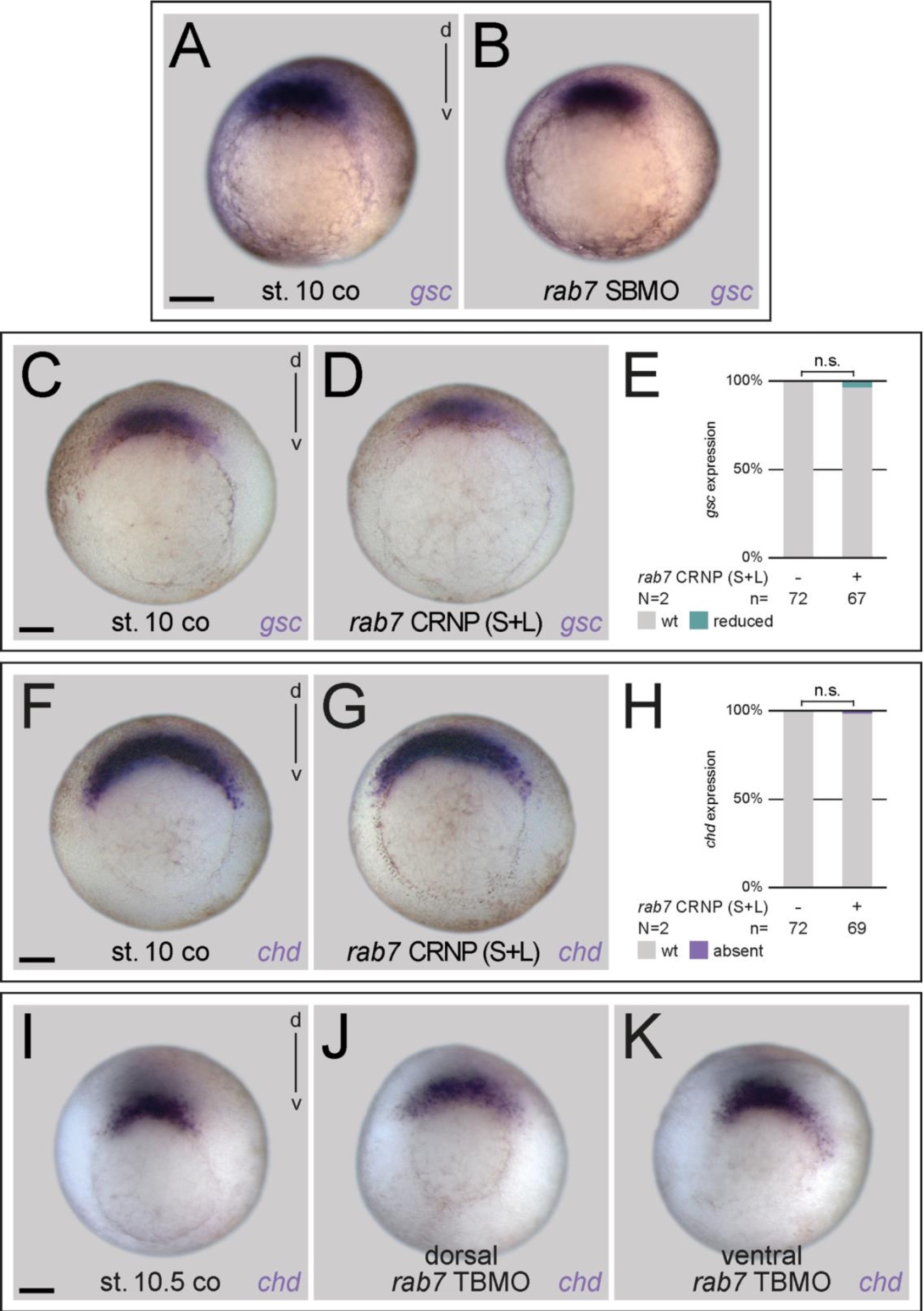 Fig. S5. Loss of Rab7 does not impact organizer gene expression or DV patterning. (A,C) St. 10.5 untreated controls showing wildtype gsc expression (B,D) comparable to embryos either injected with rab7 SBMO or rab7 CRNP (S+L). (E) Quantification of results in (C-D). (F) Wildtype chd expression in control embryos were unaffected in embryos injected with (G) rab7 CRNP (S+L). (H) Quantification of results in (F-G). (I) DV range of chd expression of control embryos was unaltered in embryos injected with rab7 TBMO in (J) dorsal or (K) ventral lineage. Scale bars: 250μm co, control; CRNP, Cas9 Ribonucleoprotein; d, dorsal; n.s., not significant; v, ventral; wt, wildtype. |