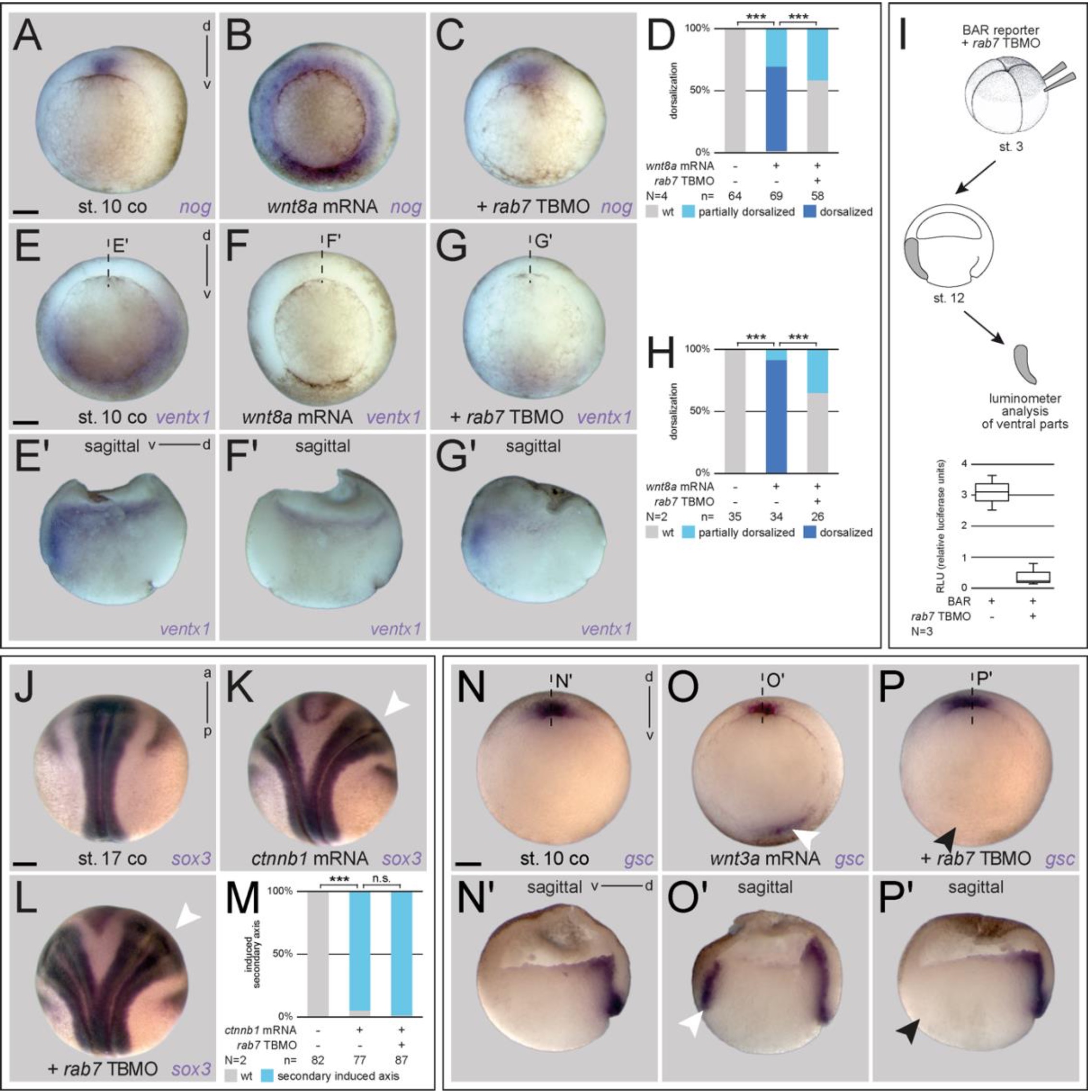 Fig. S7. Rab7 is required for exogenous activation of canonical Wnt pathway. (A) Wildtype dorsal expression of nog in st. 10 embryos in comparison to specimen with (B) radial injected wnt8a mRNA showing complete dorsalization by extended nog expression around the blastopore. (C) Co-injection of rab7 TBMO restricted nog expression to normal wildtype area again. (D) Quantification of results in (A-C). (E) Wildtype ventral expression of ventx1 in st. 10 embryos, (E') sagittal section as indicated in (E) showing ventx1 expression domain. (F) Loss of ventx1 expression upon radial wnt8a mRNA injection, (F') highlighted in bisected embryo. (G) Co-injection of rab7 TBMO partially restored lost ventx1 expression, (G') which in the sagittal section remained smaller and weaker on ventral side. (H) Quantification of results in (E-G). Please note premature (st. 10) appearance of fully radial lips in (B,F) but not in (A,C,E,G) in same age specimens. (I) Late gastrula Luciferase-based BAR-reporter assay (bottom) demonstrating tissue-specific inhibition of endogenously induced Wnt reporter activity in the ventral mesoderm (middle) after co-injection of rab7 TBMO into the ventral mesodermal lineage at 4-cell stage (top). (J) Wildtype AP axis in control specimen. (K) ctnnb1 induced right-sided secondary axis (white arrowhead), (L) which was not inhibited by rab7 knockdown (white arrowhead). (J-L) Axes highlighted by sox3 expression. (M) Quantification of results in (J-L). (N) Control embryos showing normal dorsal gsc expression, (N') confirmed in sagittal section indicated in (N). (O) Ventral wnt3a mRNA injection induced second organizer marked by gsc (white arrowhead), (O') sagittal section revealed additional ventral gsc positive domain (white arrowhead). (P) Lost second gsc expression upon parallel rab7 TBMO injection (black arrowhead), (P') highlighted in sagittal section (black arrowhead). Scale bars: 250μm a, anterior; co, control; d, dorsal; n.s., not significant; p, posterior; v, ventral; wt, wildtype. |