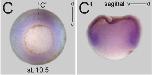 rab7a (RAB7A, member RAS oncogene family) gene expression in X. laevis embryo NF stage 10.5, assayed via in situ hybridization, dorsal up (C), and in sagittal section(C') with dorsal right. |