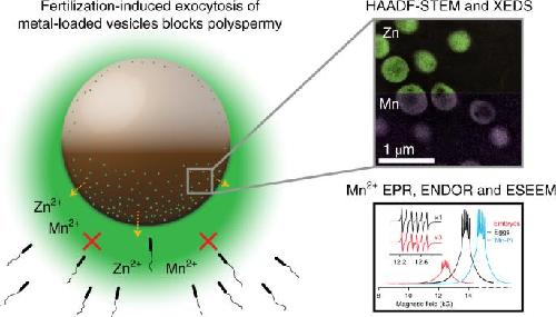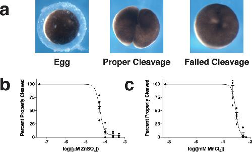 Figure 7:. Extracellular zinc or manganese inhibits fertilization in a dose-dependent manner.Both extracellular zinc and manganese block fertilization. a. Images of an unfertilized Xenopus egg (in jelly coat), a properly dividing embryo (first cleavage), and an instance of failed cleavage (meiotic catastrophe). b. An IC50 graph of the effects of extracellular ZnSO4 on the rate of fertilization. IC50 = 53 μM (95% CI = 47 â 61 μM, R2 = 0.94). Data are presented as mean percentage of eggs properly fertilized ± SEM, n = 4 frogs (39 â 102 eggs per datapoint). See Supplemental Figure 11 for raw data. c. An IC50 graph of the effects of extracellular MnCl2 on the rate of fertilization. IC50 = 890 μM (95% CI = 770 μM â 1.0 mM, R2 = 0.93). Data are presented as mean percentage of eggs properly fertilized ± SEM, n = 4 frogs (36 â 100 eggs per datapoint). See Supplemental Figure 12 for raw data.