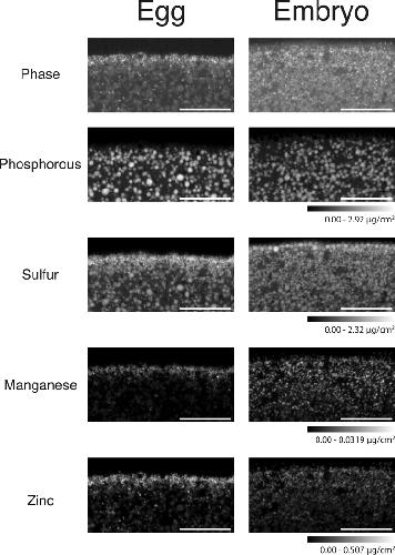 Figure 4:. Synchrotron-based X-ray fluorescence mapping of egg and embryo cortices.X-ray fluorescence microscopy images of the animal pole of fixed Xenopus egg/embryo slices show zinc and manganese are localized in small cortical compartments. Scale bar = 20 μm. Images acquired at Beamline 2-ID-D at Argonne National Laboratory. Pixel size: 300 à 300 nm, slice thickness: 2 μm, scan time: 500 ms/pixel. These are representative images of slices of eggs/embryos from 7 different frogs imaged over 3 experiments.
