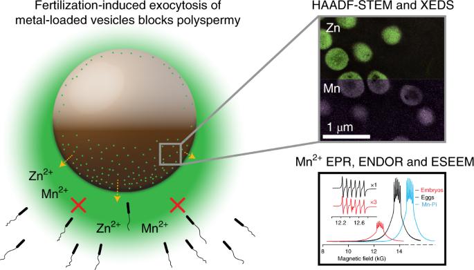 Figure 3:. Paramagnetic resonance measurements of eggs and embryos.EPR confirms a post-fertilization decrease in manganese, while EPR, ENDOR, and ESEEM demonstrate that the majority of intracellular manganese is bound to a low molecular weight carboxylate. 35-GHz, 2K EPR/ENDOR/ESEEM Spectra: a. Representative absorption-display CW-EPR spectra of Mn2+ in: frog eggs (black); embryos (red; 1/3 amplitude of eggs, ~30 ± 10% remaining, see text); Mn-orthophosphates Mn-Pi (blue; scaled to eggs); EPR spectra of frog eggs/Mn-Pi offset by +1,350/+2,350. Inset: digital derivatives of the spectra, accentuating the six-line 55Mn hyperfine pattern around 12kG magnetic field. b.