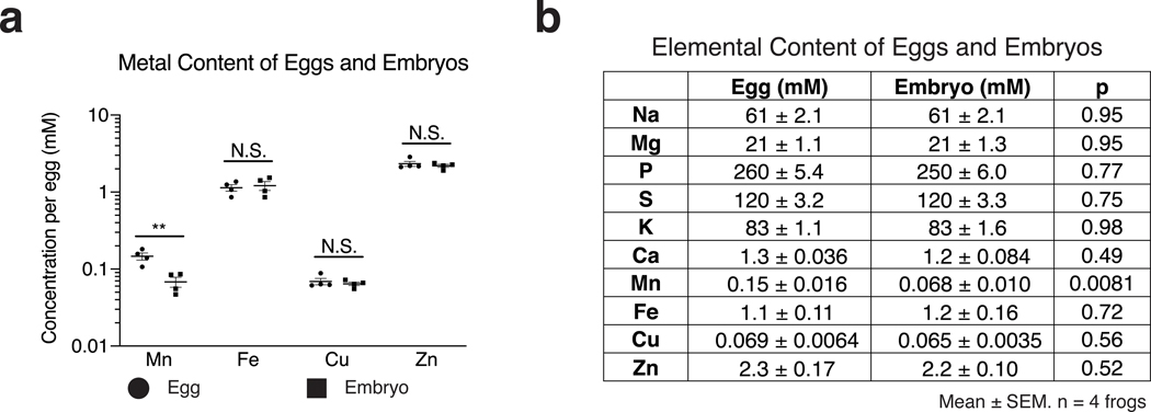 Figure 2:. Elemental analysis of eggs and embryos.ICP-MS measures a significant decrease in intracellular manganese post-fertilization. a. Metal concentrations of Xenopus eggs and embryos (1 hour post-fertilization) determined by ICP-MS. Intracellular Co and Ni are both below 13 μM. Data are presented as mean ± SEM per egg/embryo, **: p = 0.0081. Each point corresponds to ICP-MS analysis of a batch of 20 eggs normalized to a per egg basis. Similar results were obtained in 6 separate experiments (not shown). b. Elemental contents (mM) of Xenopus eggs and embryos (1-hour post-fertilization). Experimental conditions as in a. In both a. and b. n = samples from 4 separate frogs analyzed in a single ICP experiment. p is the significance of the change in elemental content following fertilization. Two-tailed, heteroscedastic T-tests were run between eggs and embryos in order to determine if there was a significant difference in metal content. No adjustments were made for multiple comparisons.